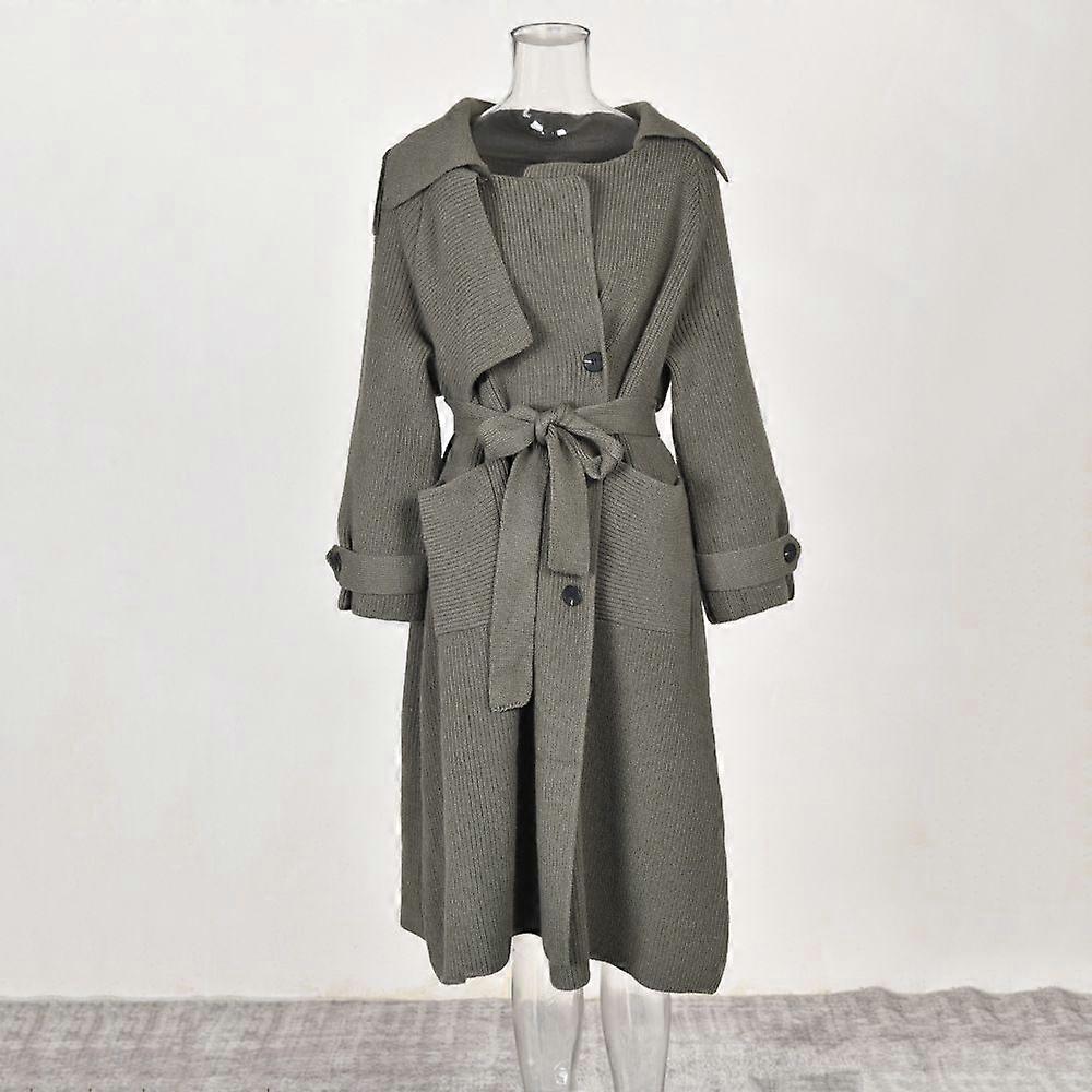 Fashion Women's Knitted Cardigan Laps Belted Waist Double-Breasted Solid Color Long Sweater Coat Autumn