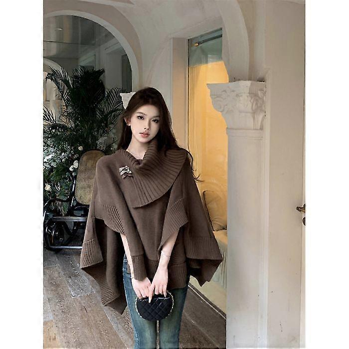 A Laid-Back White Cape Sweater For Women In Autumn And Winter, A Loose One-Shoulder Knitted Sweater Worn Over A Smock Coat