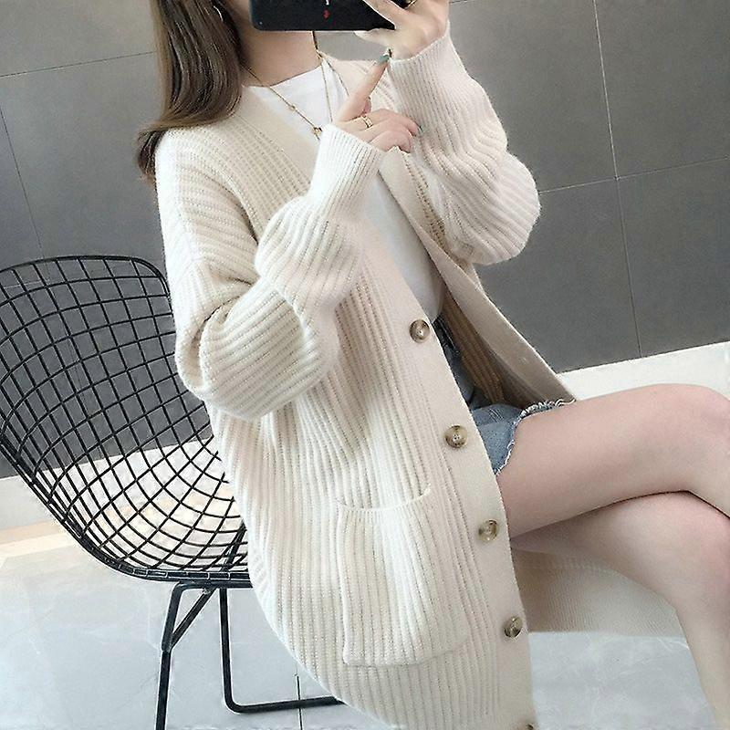 Sunken Stripe Mid-Length Knitted Cardigan Women's Autumn And Winter Korean Style Loose V-Neck Solid Color Striped Sweater