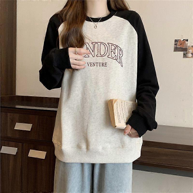 A Real Shot Of An American Retro Shoulder-Sleeved Hoodie For Women In Early Autumn. It's A Thin, Loose And Versatile, Color-Blocking Round-Neck Top