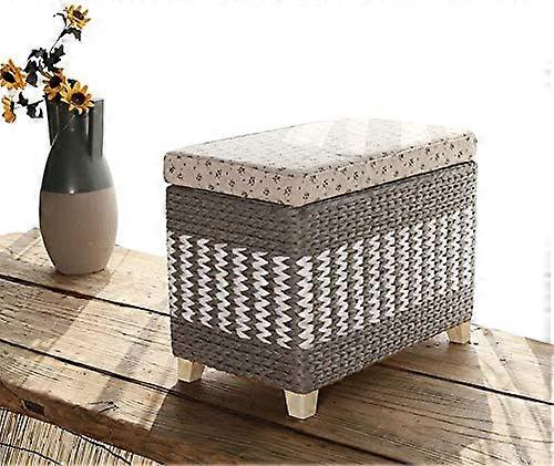 Rattan Storage Basket Ottoman - Grey Wicker Footstool with Solid Wood Frame, 50x30x40cm for Living Room Storage