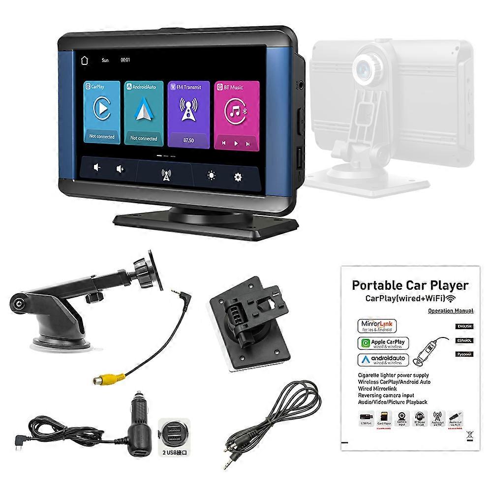 7 Inch Car MP5 Player with Bluetooth FM Radio Built-in Dash Cam Multimedia Video Receiver for Most Vehicles Features: 1、Can connect to mobilephones and use voice assistants, make and receive calls, and navigation functions. 2、Equipped with a built-in camera, it can record driving conditions and leave a record in the event of a collision, making driving safer. 3、Multiple audio output methods: support built-in speakers, AUX cable, FM transmission audio output. 4、The large screen automatically switches the reversingimages when engaging the reverse gear, has a wide angle of view, and is equipped with a reversing auxiliary line, which ensures the safety of reversing. (reversing camera not included) 5、Support the mobilephone screen projection function, which allows the mobilephone screen to be projected onto this machine. 6、PlugAndPlay, easy to install, suitable for lots of kinds of car. Specification: The vehicle-mounted MP5 player is equipped with 2 types of brackets, which is very practical to use and convenient to install and remove, and the driving process is more interesting and safer. Features: Can connect to mobilephones and use voice assistants, make and receive calls, and navigation functions. Equipped with a built-in camera, it can record driving conditions and leave a record in the event of a collision, making driving safer. The large screen automatically switches the reversingimages when engaging the reverse gear, has a wide angle of view, and is equipped with a reversing auxiliary line, which ensures the safety of reversing. (reversing camera not included) Multiple audio output methods: support built-in speakers, AUX cable, FM transmission audio output. Support the mobilephone screen projection function, which allows the mobilephone screen to be projected onto this machine. PlugAndPlay, easy to install, suitable for lots of kinds of car. Specifications: Main color: black FM: 87.5-108MHz Output: 1W Working voltage: 12-30V Working temperature: -10 to 60℃ BT: 5.0 Resolution: 1024*600 Screen size: 7in Install size: Suction cup bracket: 65 * 65mm / 2.6 * 2.6in Countertop bracket: 120 * 68mm / 4.7 * 2.7in Panel size: 190 * 111mm / 9.5 * 4.4in Machine thickness: 23mm / 0.9in Languages: English, Chinese, Spanish, Portuguese, Russian, German, French, Polish, Türkiye, Arabic, Hebrew, Italian, Czech, Japanese, Korean Package size: 225 * 130 * 145mm / 8.9 * 5.1 * 5.7in Package weight: 730g / 1.6lb Packing List: 1 * Car MP5 Player 2 * Bracket 1 * Reversing Video Cable 1 * Car-Use Power Cable 1 * AUX Cable 1 * User Manual Package List: 1 * Car MP5 Player 2 * Bracket 1 * Reversing Video Cable 1 * Car-Use Power Cable 1 * AUX Cable 1 * User Manual