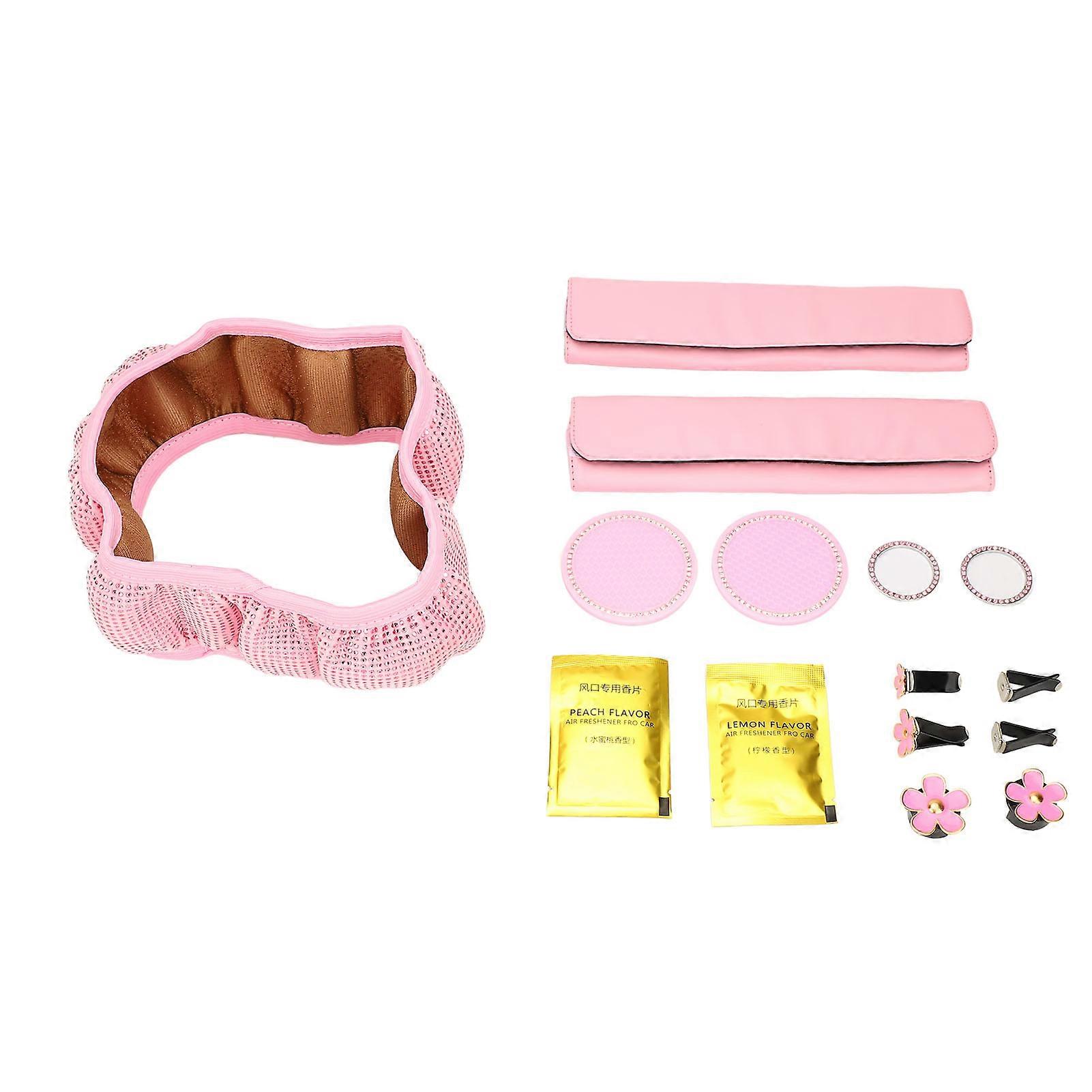 13PCS Pink Rhinestone Car Accessories Set for Women with Steering Wheel Cover Coaster Starter Ring and Air Vent Clip
