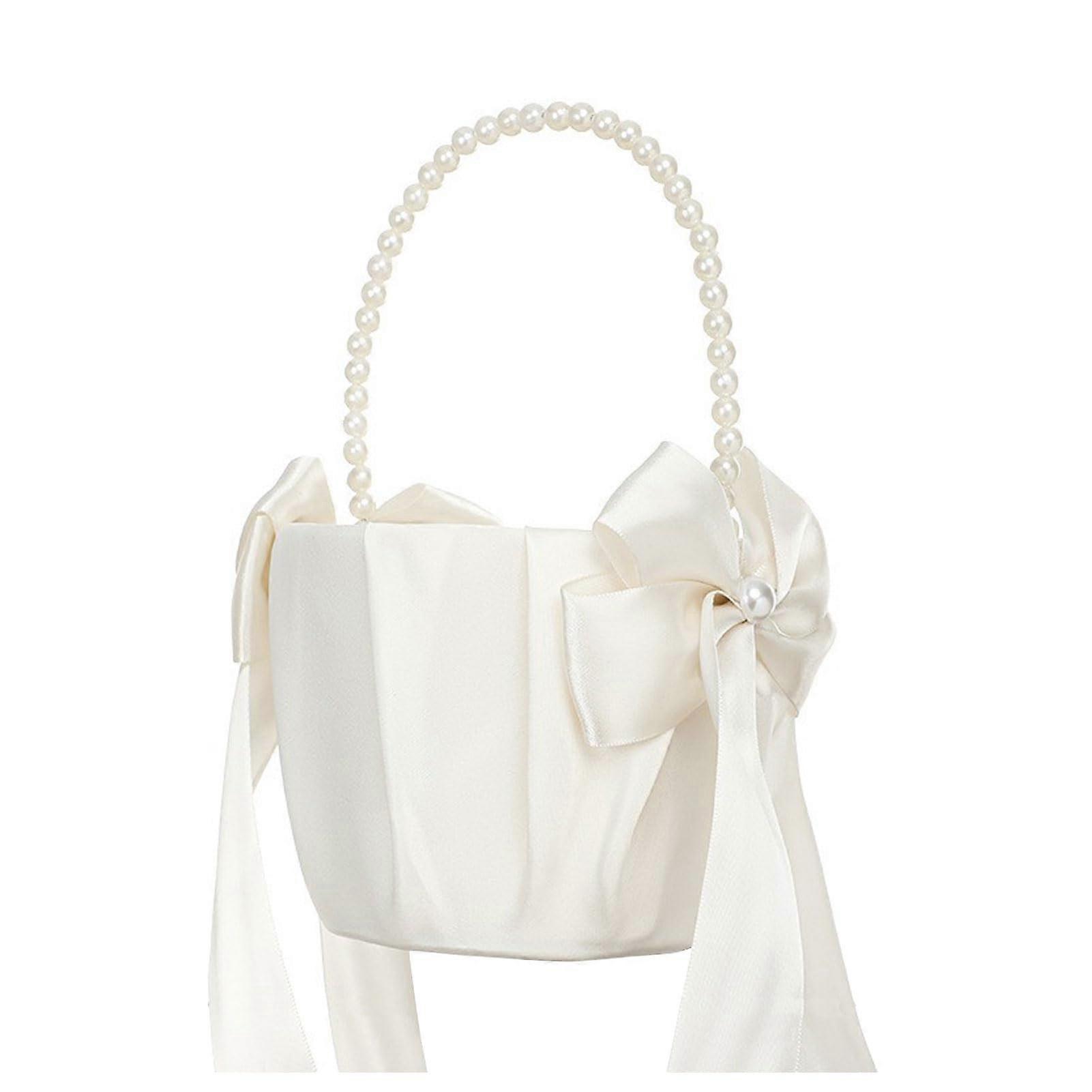 Ivory White Satin Wedding Flower Girl Basket with Pearl Handle, Ring Pillow with Satin Bow, Romantic Flower Basket