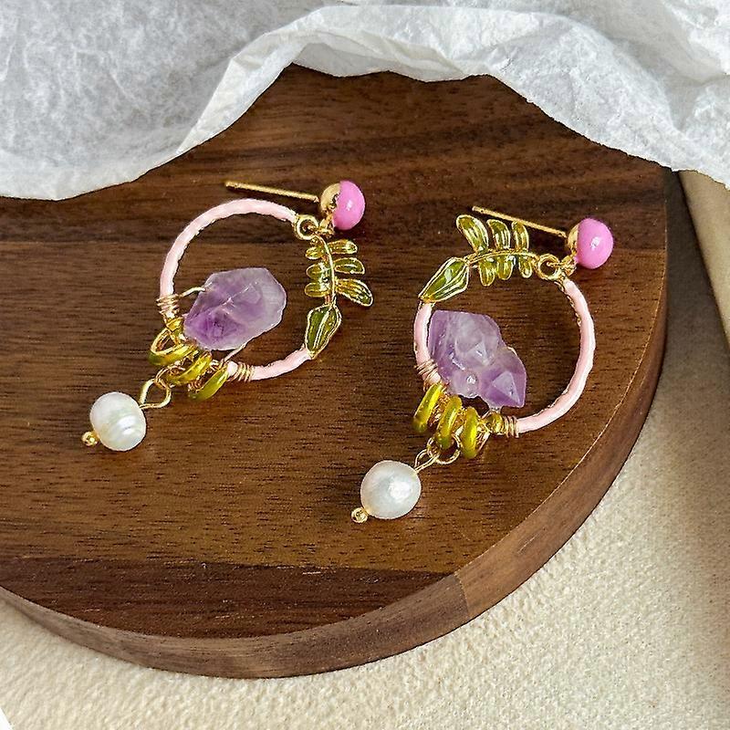 Bohemian - Style Hoop Earrings, Pink Hoops with Amethyst, Pearls & Leaf Details, Vibrant & Artistic, Ideal for Bohemian Outfits or Festivals