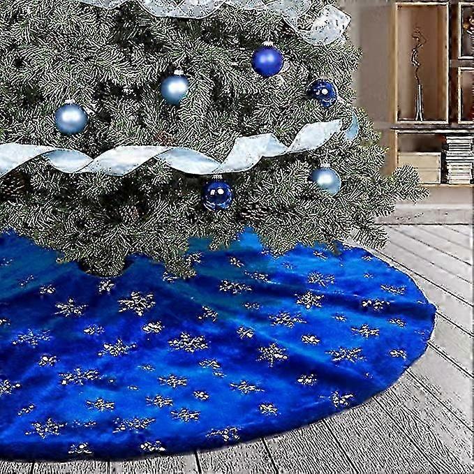 Festive Tree Skirt with Snowflake Design Silver Sequin Trim Blue Plush Base Cover for Holiday Decor