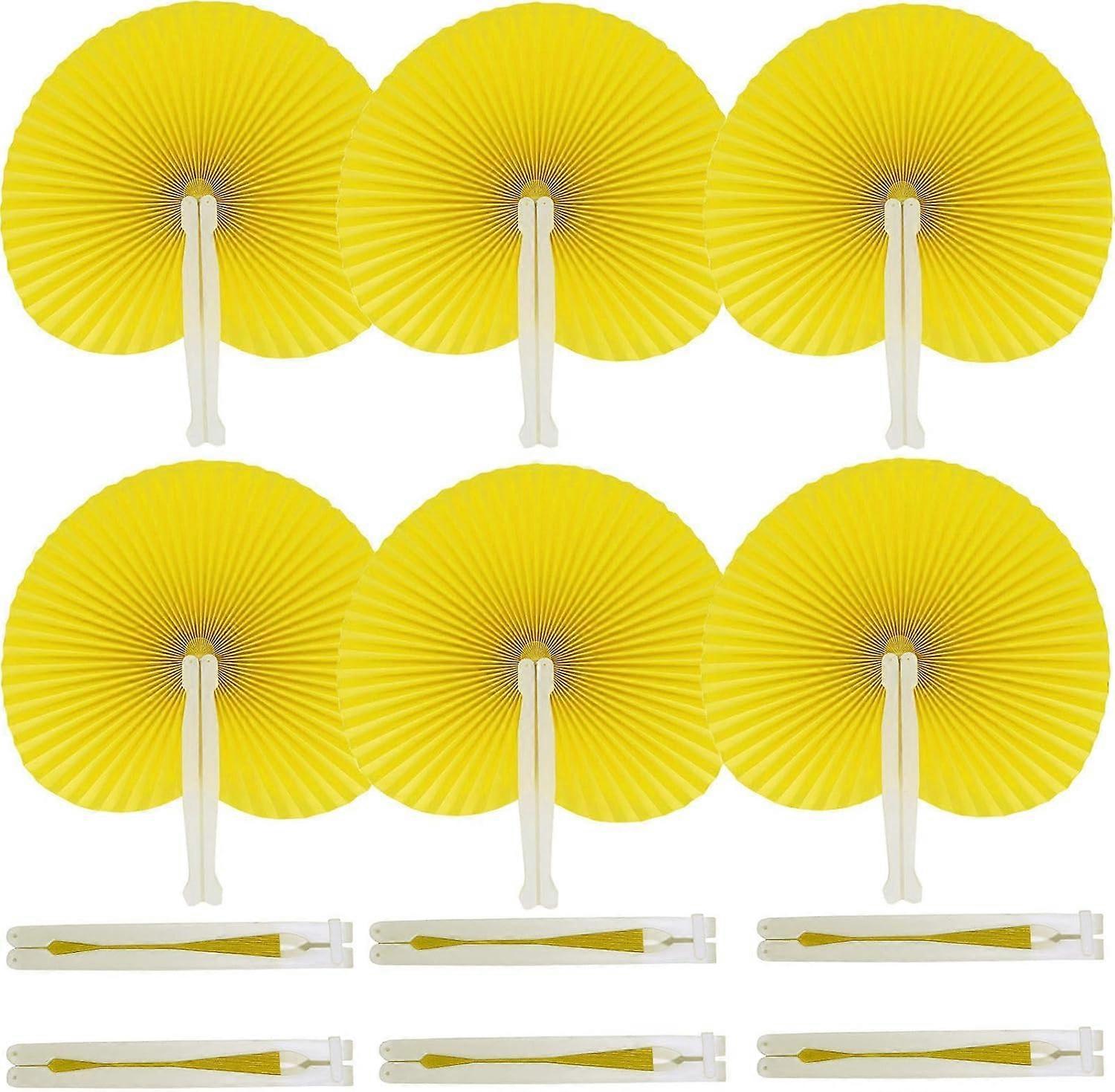 6-Piece Decorative Paper Folding Hand Fan Handheld, Yellow Round Wedding Foldable Fan Chinese and Japanese Fan Bulk Suitable for Bride Guests Church P