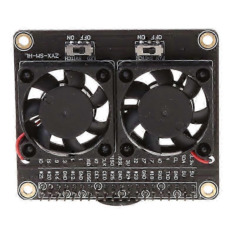 Description 4B Dual Fan 4B Heatsink Kit 4B GPIO Expansion Board for DC 5V 0.2A with LED for 4B / 3B + / 3B / 3A Product features: 1.Compaitable with 4B / 3B+ / 3B / 3A+ 2.for all versions of 3.Clear pindefinition bysilkscreen on PCB, GPIO function fully displayed. All GPIO pins are pulled out, So when the is being cooled, its development function will not be affected. 4.Thedualcooling fans are designed for active cooling mode, the heat can be discharged in for time. 5.LED and fan both have independentswitch, you can control the LED and fan separately,itwill not bring the dazzing feeling when you use it in the night. Package contents: 1xExpansionboard module with double Fans and LED 4xCopper column(column double pass M2.5*17mm) 8 x Screw( M2.5*5 countersunk screw) 1 x Screwdriver 1x plastic bottom base logo label 4x PCB Spacer