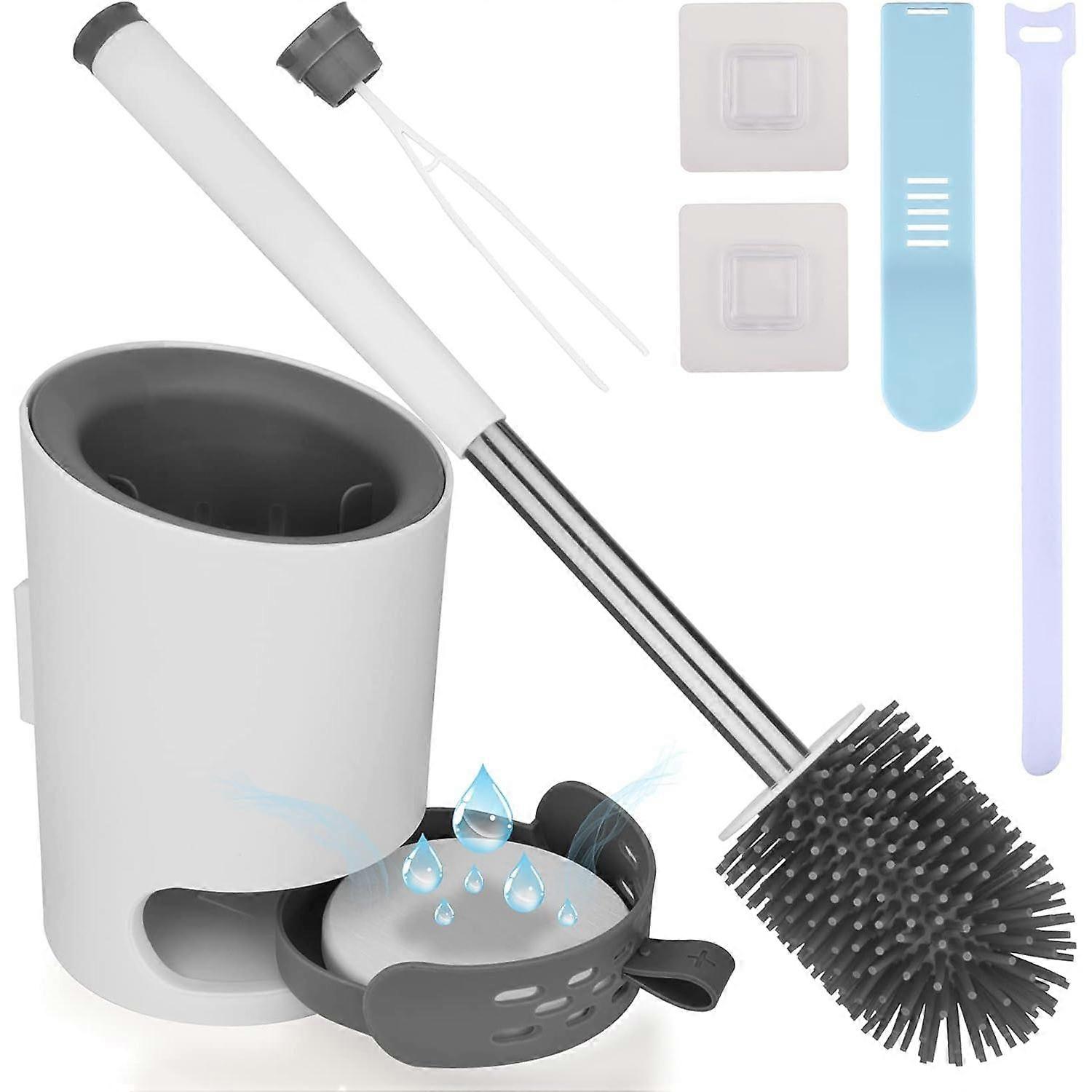 1, [Perfect Design] Package includes: 1 x toilet brush and holder, 1 x diatomaceous mud, 1 x toilet seat lifter, 2 x adhesive hooks. The innovative natural diatomaceous mud pad can quickly absorb water, effective antibacterial against mold and remove odor. With this toilet seat lifter/handle, you can lift the toilet seat without touching it. All components of the brush can be quickly disassembled and easily installed. 2, [360° Deep Cleaning] The silicone toilet brush head is made of wear-resistant TPR (thermoplastic) material, which can clean toilet bowl stains without damaging the toilet enamel. Unlike plastic bristles, the anti-bristle adhesive brush is easy to rinse, soft enough to penetrate the toilet pipes and grooves, easily remove dead stains, and is difficult to deform to maintain a full cleaning force. 3, [No Spill & Quick Dry] Featuring a hollow suspension design, the upgraded silicone toilet brush holder helps with ventilation and allows excess water to evaporate quickly. The toilet brush's unique built-in drip drawer prevents water stains from contaminating the floor and is also very convenient to remove for cleaning. The innovative diatomaceous mud inside the brush holder drawer can quickly evaporate moisture and remove odor. 4, [Convenience & Happiness] The toilet cleaning brush with PP and aluminum handle and ergonomic design makes cleaning easier and reduces cleaning time. No need to press for a perfect clean. There are also hidden tweezers on the top of the stainless steel silicone brush handle for easy cleaning of bathroom residue and small garbage. The simple and beautiful design coordinates with your bathroom, it is a perfect bathroom accessory. 5. [Dual Use] The toilet brush head with rounded base can be stably placed on the floor or on the holder. With the included 2 adhesive hooks, you can hang our hanging toilet brush on different walls without drilling holes, saving floor space.