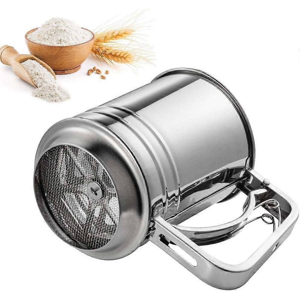 Stainless Steel Flour Sifter - Our baking flour sieve is made of high-quality stainless steel, which has a polished surface, is safe and will not hurt your hands. After long-term use, it will not rust. Stainless steel is lightweight but stronger than aluminum or plastic, so you don't have to worry about cracks, chips, dents, and scratches. Double-layer Mesh Design - Double-layer fine mesh, the mesh is fine enough to quickly filter impurities in the powder, expand the structure of the flour, and increase the air content of the flour. Perfect for sifting flour, almond powder, icing sugar, or similar powders. We have improved the packaging; each product is fixed and packed in a cardboard box to ensure that it is not damaged during transportation. One-handed Operation - This kitchen sieve has a cup design that allows you to easily hold it with one hand. You only need to press the one-press trigger, the powder can be filtered, and it is easy to use. Simply place the flour sieve over a bowl with the mesh facing down. The fine mesh does the hard work for you—all you have to do is shake, and the flour, icing sugar, or baking soda will come out lump-free. High Volume & Lightweight: Large capacity and large diameter design, reducing the amount of time spent in front of the screen, saving time and effort. You can sift over 400g of flour at a time—large enough to prevent flour from overflowing like a hand-cranked sieve. It's easy and comfortable to hold. Easy to Clean & Dishwasher Safe: Easy to clean, you can simply tap the sieve with your hand or clean it with a hair dryer. Dishwasher safe for quick and easy cleaning. An essential kitchen tool for a better cooking experience, making it the best sieve for cooking. You can enjoy delicious food and the fun of cooking. It's the perfect gift for women, parents, grandparents, and any baker.