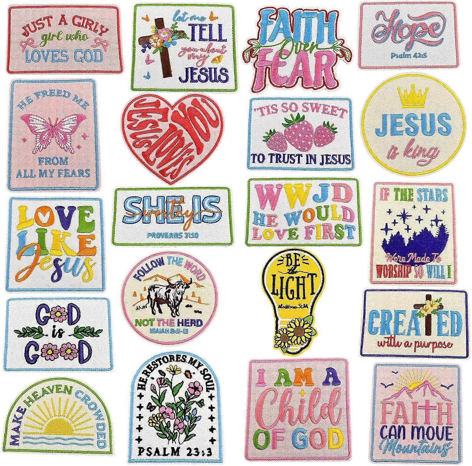 20 Pcs Assorted Iron On Patches - Vintage & Christian Embroidered Designs Mix of inspirational Bible verses and trendy motifs (2.7" average size). High-quality polyester embroidery with heat-activated adhesive backing Premium Quality Construction Durable polyester yarn and non-woven fabric withstand washing. Features odorless, non-toxic adhesive that bonds securely when ironed Easy Application Process Simply iron at 150C (cotton setting) for 30-60 seconds. For extra durability, sew around edges after ironing Versatile Repair & Decoration Perfect for: Covering holes in jeans/jackets Personalizing trucker hats and backpacks Church group craft projects Adding faith-based inspiration to clothing Meaningful Gift Option Ideal for Christian communities, youth groups, and crafters. Bulk pack provides enough for multiple projects.