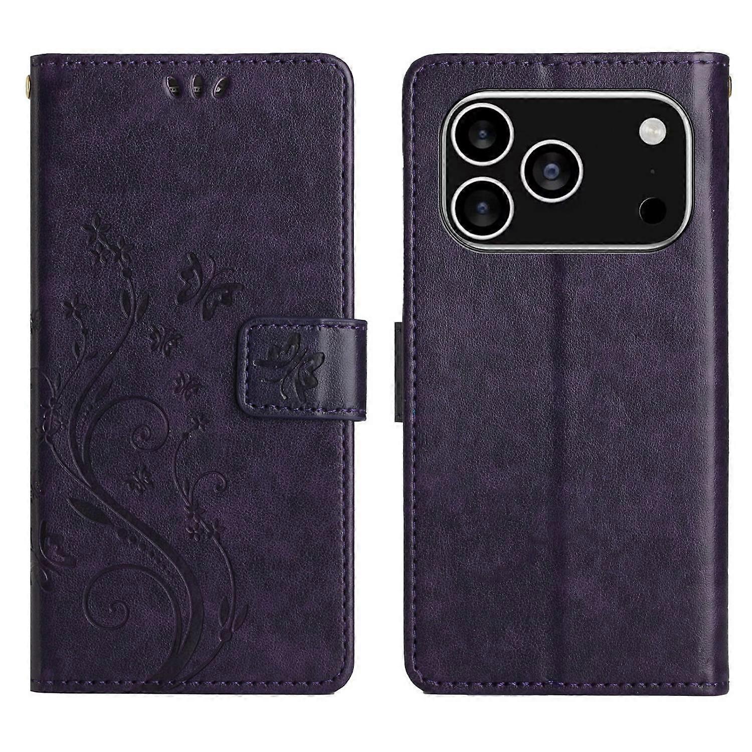 For iPhone 17 Pro Leather Wallet Case Butterfly Flower Imprinted Phone Cover with Strap - Dark Purpl