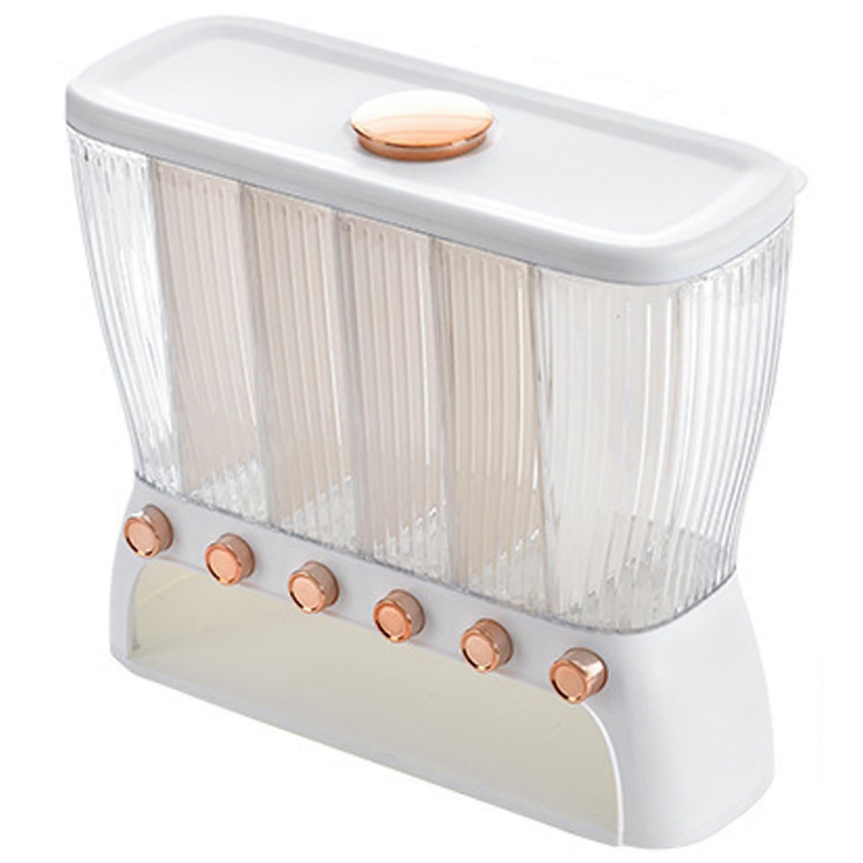 Dry Food Dispenser with 6 Compartments, Large Capacity Clear Rice Bucket with Lid and Cup for Kitchen Storage