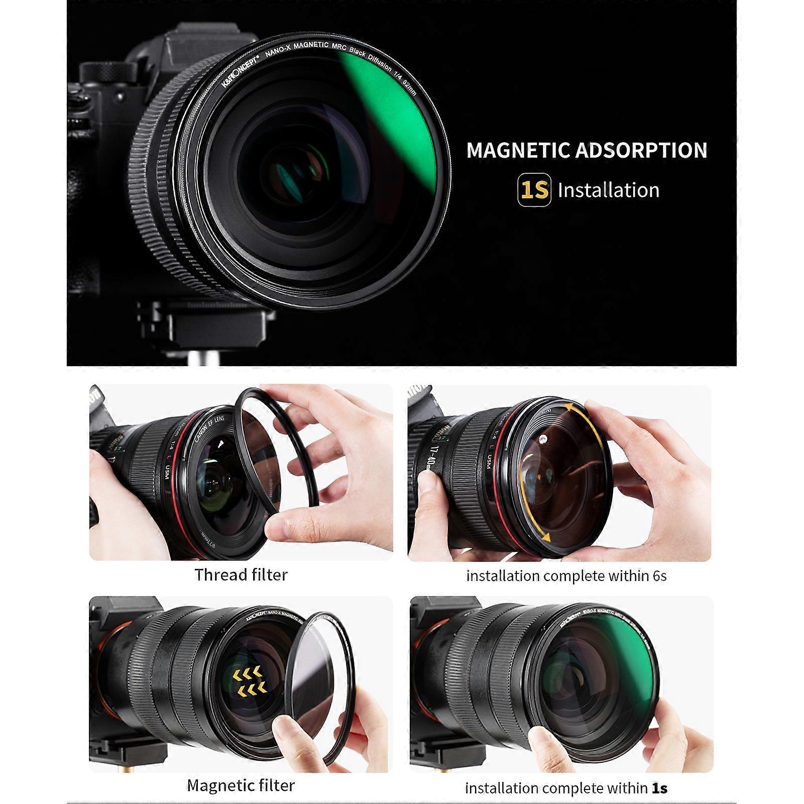 Feature: 1. Black diffusion 1/4, can effectively soften wrinkles, freckles, pores of facial skin, also and light spots, making it more delicate and gorgeous. 2. Made from high-quality optical glass, 84% transmittance, reducing ghost and shadows, the images are clearer. 3. Aluminum alloy frame made with CNC exquisite workmanship, sturdy and durable, not easy to deform. 4. Double-sided coated with multilayer green film of low reflectivity, mould proof, waterproof, scratch-resistant and oil-proof. 5. Professional photography replacement accessory, widely suitable for dynamic photography, night scene photography, portrait, etc. 6. With adapter ring and lens cap, magnetic design, easy to install and disassemble, fitting well with cameras lens. Specification: Features: Black diffusion 1/4, can effectively soften wrinkles, freckles, pores of facial skin, also and light spots, making it more delicate and gorgeous. Made from high-quality optical glass, 84% transmittance, reducing ghost and shadows, the images are clearer. Aluminum alloy frame made with CNC exquisite workmanship, sturdy and durable, not easy to deform. Double-sided coated with multilayer green film of low reflectivity, mould proof, waterproof, scratch-resistant and oil-proof. Professional photography replacement accessory, widely suitable for dynamic photography, night scene photography, portrait, etc. With adapter ring and lens cap, magnetic design, easy to install and disassemble, fitting well with cameras lens. Specifications: Color: Black Material: Aluminum alloy & glass Filter Size: 49mm, 52mm, 55mm, 58mm, 62mm, 67mm, 72mm, 77mm, 82mm(optional) Note: The camera and camera lens showed in the pictures are not included. Package List: 1 * Filter 1 * Adapter Ring 1 * Lens Cap Package List: 1 * Filter 1 * Adapter Ring 1 * Lens Cap