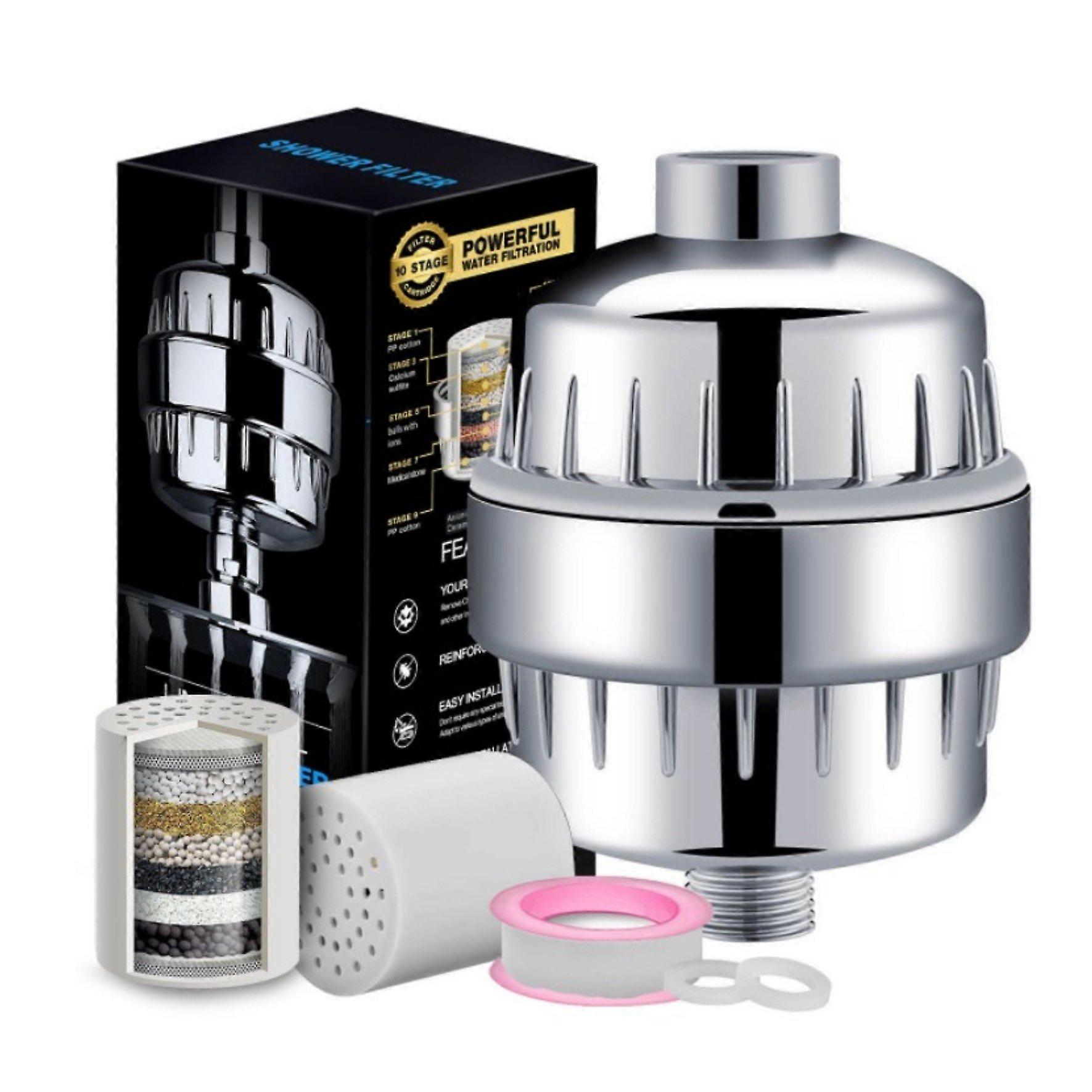 - 10-STAGE SHOWER HEAD FILTER: This universal shower filter features multiple filtering layers including activated carbon, KDF 55, calcium sulfite, cotton, metal mesh, tourmaline balls, germanium, and magnetic energy ceramic balls. This proven combination effectively purifies hard shower water. - IMMEDIATE SHOWER QUALITY IMPROVEMENT: Experience superior filtration that rapidly reduces harmful chemicals like fluoride, chlorine, lead, and chromium. Enjoy softer water without compromising the high flow rate of your shower head, ensuring a refreshing experience for you and your family. - SOFT WATER BENEFITS: Enjoy the advantages of purer water, which leads to softer skin, smoother hair, and a reduced risk of respiratory issues such as asthma and bronchitis. Showering in chlorine-free water can also boost your energy levels. - CONSISTENT WATER PRESSURE: Our high-performance inline water filter maintains your existing water pressure, allowing for an enhanced rinse. It acts as a moisturizer and purifier, providing a gentle touch for sensitive skin during your body wash. - VERSATILE APPLICATIONS: Ideal for families, individuals with skin sensitivities, and those living in areas with hard water. Perfect for daily showers, spa-like experiences at home, or as an upgrade for your existing shower system. This shower filter is designed to meet your needs for cleaner, softer water while enhancing your overall shower experience.