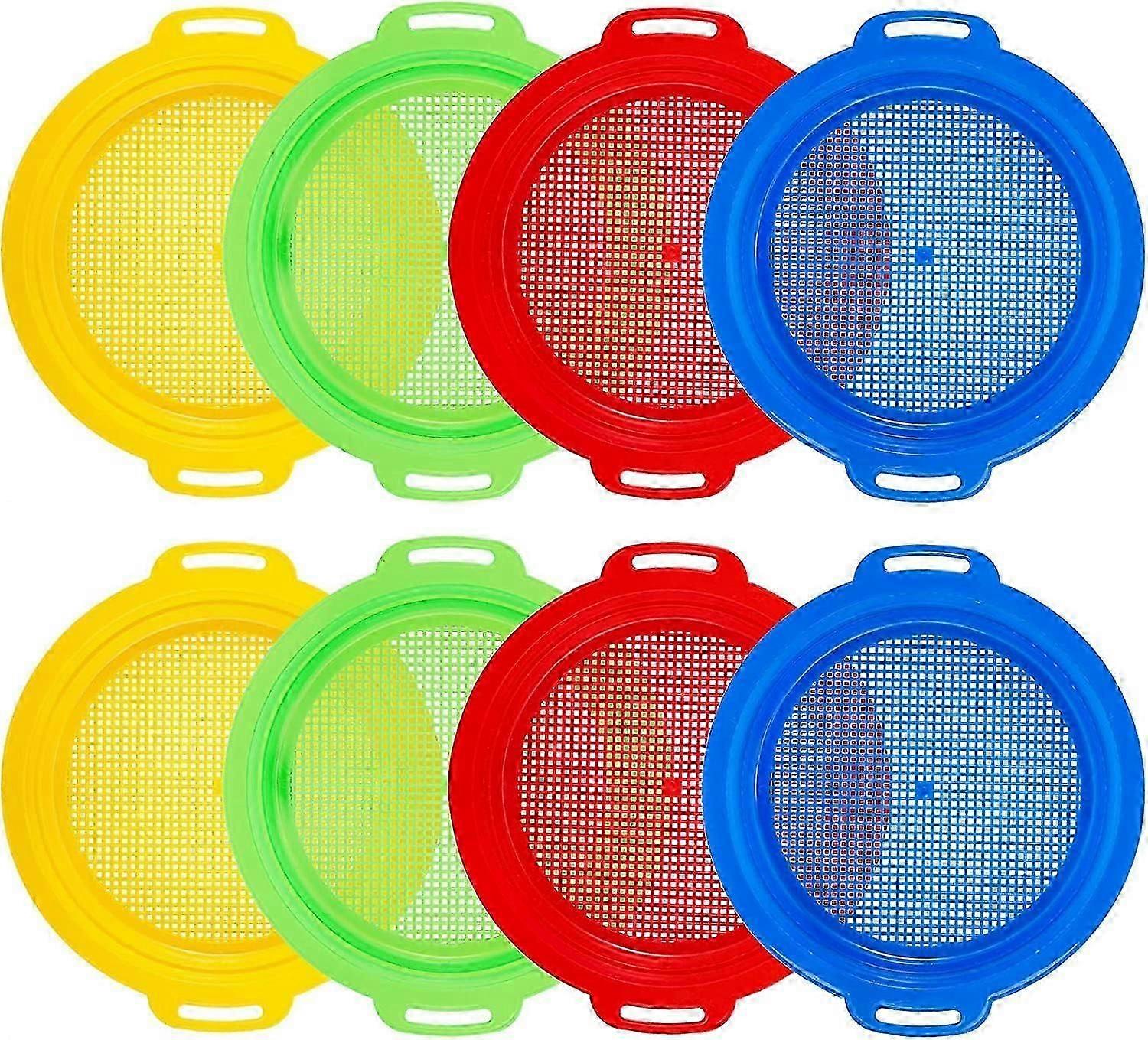 Package: Complete set of 8 sturdy plastic sand sifter sieves! Each sand sifter sieve measures 8.75" x 9.75". The perfect size for little kids! Recommend for Ages 3+.Sifting pan set comes with 2 red, 2 blue, 2 yellow & 2 green - 8 total! Kids can search for even more treasure in the coarse or fine sand!The beach toys are great for sand box, beach, backyard and so much more! When playing on the beach, children can use the sand sieve to filter out the sand and find small shells, so that children can experience the fun of find treasure.Sand sifter set is also a great gift for your friends and family. They are very good hands-on toys and perfect for family to play together outdoors, it is conducive to enhance the relationship.Sand sifters are made of durable plastic material, which is durable and can be reused multiple times. The shape of the product is exquisite and cute, and the colors are bright, which will attract your children to play.8 pack plastic sand sifter sieves feature 4 different colors: blue, red, yellow and green. Now you can retrieve treasure anywhere! These sifter sieves are great for the beach or the sand box! The perfect size for little kids! Makes a great gift & is perfect for schools, party favors, beach, park, special needs, stress relief and so much more!