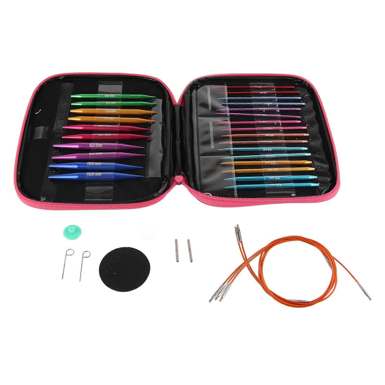 Interchangeable Needles Set Colorful Aluminum Circular Knitting Needles Ring Set for DIY Craft Features: It is made of aluminum, anti-rust and durable. With many different size needles, it is essential for knitting sweaters and scarves. Needles are interchangeable, the cable can be extended using connect tools if it is not long enough, it can meet the needs of a variety knitting. Needle tips are durable and lightweight, your hand will not feel any pain even for hours knitting. There is a PU bag in this set, it can storage and protect your needles safely. Specification: Material: Aluminum Weight: Approx.325g/11.5oz Package: PU bag Needle Size: 3.0mm/3.25mm/3.5mm/3.75mm/4mm/4.5mm/5mm/5.5mm/6mm/7mm/8mm/9mm/10mm Cable Length: Approx.32cm/12.6in  38cm/15in  42.5cm/16.7in  55cm/21.7in Package List: 13 * Pairs of Aluminum Needles 4 * Round Plastic Threads 4 * Position Buttons 1 * Tool Patch 1 * Mini-spanner 1 * Extended Connection Tool 1 * PU bag Note: Please allow slight measuring deviation due to manual measurement.
