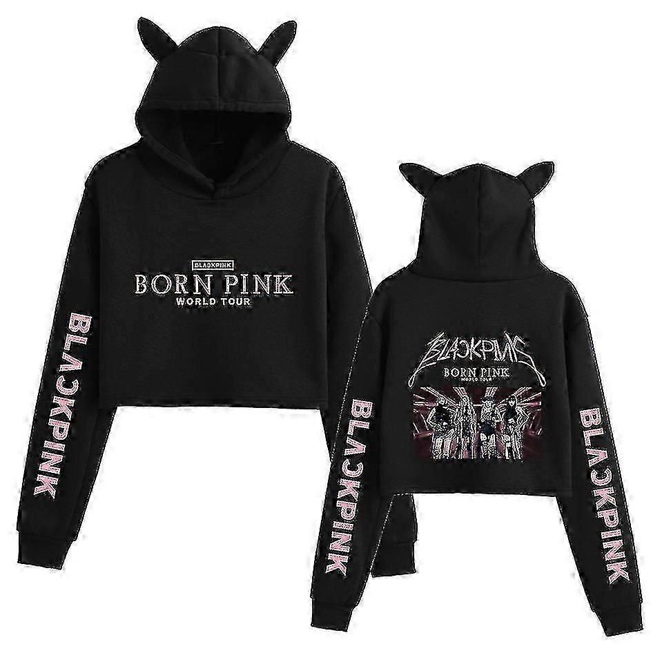 Black Pink Korean Group Printed Sweatshirt - Casual Navel-Baring Top with Cat Ears Design for Girls Fashion