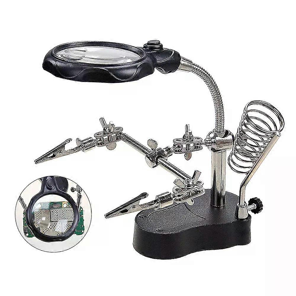 Portable Soldering Iron Station LED Magnifying Glass Soldering Iron Stand Rework Station Desktop Magnifier Soldering Repair Tool Features: 1.High definition lens: This assistant soldering station features high-quality optical glass lenses with magnification of 3.5X and 12X, making the magnified field of view clearer and preventing dizziness after long-term use. Fully considering the needs of amateurs and welding electricians, allowing you to perform precise refinement work on small parts and provide clear images without distortion or blurring! 2.Third hand: When a third hand is needed, our welding assistant hand magnifying glass is the ideal tool. You can adjust the crocodile clip of this auxiliary magnifying glass tool to the desired angle, which can firmly fix the object to be observed to achieve the best working effect. Just like the third hand, you can let go of your hands, focus on details, and provide maximum viewing comfort! 3.LED lights: The magnifying glass station of the LED luminous aid hand is equipped with sufficiently bright LED lights. You can move the mobile LED lights to the desired position, adjust the distance and angle of the lights, and work normally under low light conditions. It has sufficient brightness and a wide radiation range. It can also be used as a desk lamp alone. 4. Flexible enough: You can adjust the bracket, light, and crocodile clip of the assistant magnifying glass bracket to the desired angle to provide maximum clarity, allowing you to see complex details, ensuring perfect lighting and clarity, making the enlarged view experience better for reading and working environments! So you will feel more convenient and comfortable when using it. 5.Widely used: Our desktop magnifying glass soldering table is very suitable for PCB welding, macro photography, process carving, circuit board maintenance, building models, hobbies in handicraft projects, painting micro, debris removal, needle processing, sawing applications, diamond/jewelry cleaning, etc Parameters: Product model: MG16126-A Product weight: 340 grams (including packaging) Product magnification: 12 times (small lenses) 3.5 times (large lenses) Product size: 170 * 140 * 160mm Large working height: 150mm Packaging method: color box Product material: metal, plastic, acrylic lenses Battery model: 3 No. 7 batteries (self provided) Package includes: soldering iron frame all metal auxiliary clip * 1 _x000D_