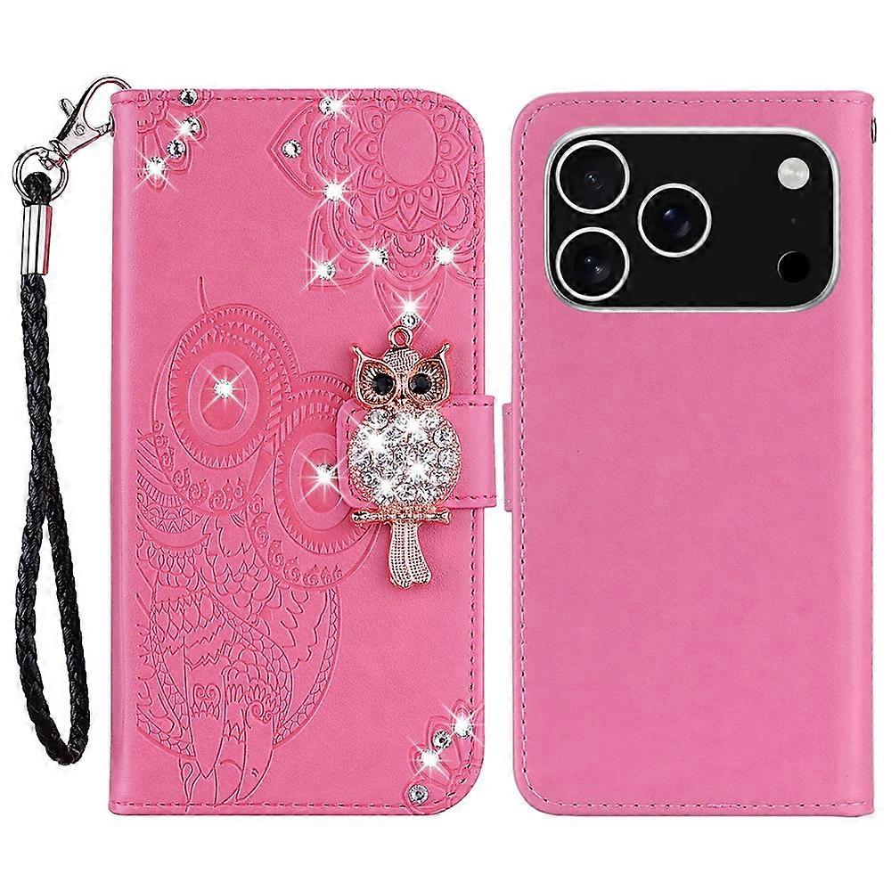 For iPhone 17 Pro Wallet Case Owl Flower Imprinted Rhinestone Leather Cover