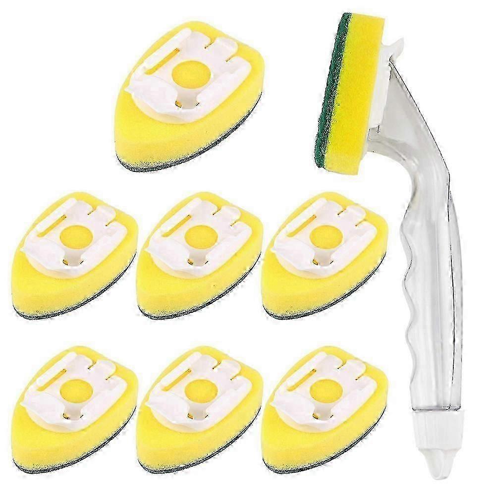 Practical Dish Washing Set: You will get 1 pieces of refillable soap control dish wands and 8 pieces of replacement head sponges, We use premium material and Tight connected process , They are not easy leak !Reliable Material: Made of double sponge and lengthened fiber, fit tightly and durable, soft and this kind of material absorbs water easily, and won't cause any damage.These replacement sponges can be applied for a long time and will not cause damage to the surface, provide lots of convenience for you when cleaning.Easy To Use: The dish wand with a handle helps to make your cleaning much more convenient.Just slight push them and the head replacement can attach to the brush handles firmly.The handle can be filled with detergent in advance,no need to pour the detergent during the cleaning process,which is able to let your hands get out of troubles.Convenient Design: The dish sponges are made of durable fiber, soft and absorbent,foam can be easily. Rubbing without deformation,helping to remove stubborn stains. The sponge will not harm the items that need to be cleaned.Efficiency Improvement: Made from durable sponges, the dish wand sponge has a helpful scrubbing surface that can help you do your cleaning faster; Even if it's a tough work, you can finish it with a better effect.Colour:As shown(Transparent+yellow+green)Material:Sponge + plasticPackage Contents:1* Dishwashing detergent brush8* sponge headsOnly the above package content, other products are not included.Note: Light and different displays may cause the color of the item in the picture a little different from the real thing. The measurement allowed error is +/- 1-3cm.