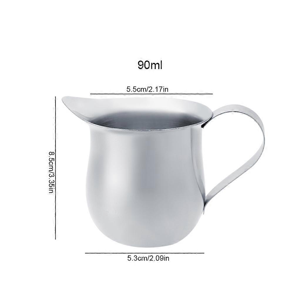 Milk Frothing Pitcher Stainless Steel Frothing Pitcher Jug for Coffee Cream Espresso(90ml) Features: Made from premium stainless steel with a polished finish and a wielded handle. Sturdy construction for daily use. Straight-sided design and drip-less spout prevents mess. Easy to clean. Rinse with soap and water. Dishwasher-safe. Perfect for frothing milk for lattes, chocolate and coffee. Ideal gift for friends and family. Specification: Condition: Material: Stainless Steel Color: Silver Capacity: 60ml/2oz, 90ml/3oz, 150ml/5oz, 240ml/8oz(Optional) Optional Size: 7.5*4.5*4.3cm / 2.95*1.77*1.69in                      8.5*5.5*5.3cm / 3.35*2.17*2.09in                       10*6.2*6.5cm / 3.94*2.44*2.56in                       11*7.2*7.2cm / 4.33*2.83*2.83in       Package List: 1* Milk Frothing Pitcher Notice: Please allow 1-3cm error due to manual measurement and make sure you do not mind before ordering. Please understand that colors may exist chromatic aberration as the different placement of pictures.