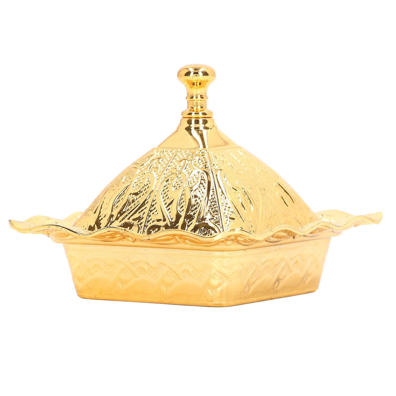 Gold Serving Bowl Vintage Mini Quadrate Shape Gold Zinc Alloy Party Turkish Bowl with Dustproof Lid for Desktop Ornament Item Type: Gold Serving Bowl Product Material: Zinc Alloy Product Use: Used for Party, Desk, Kitchen, Wedding Decoration
