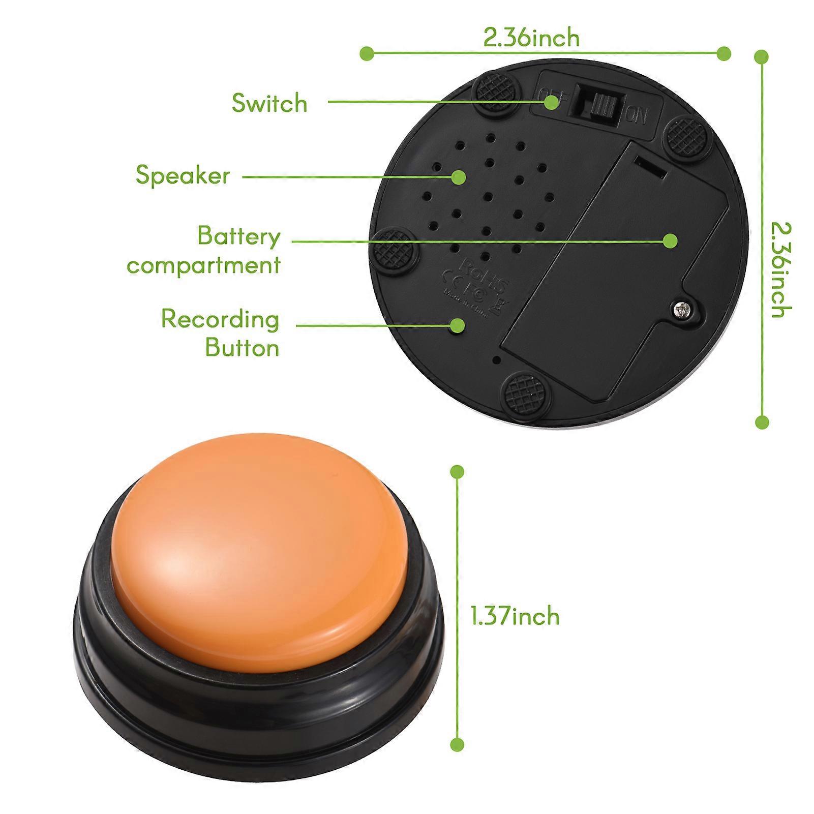 Kavolet 4PCS Voice Recording Buttons for Kids Interactive Upgrade Dog Buttons with Bone Fixing Holder for Communication Sound Buttons 30 Seconds Recordable Talking Buttons Answering Buttons This button can record your own voice and you can record after long pressing. It can also be used as a parent-child interactive , a children's language education , or as a dog talking button for communicating and training. Features: 【Customizable Sound Recording】You can record any phrase, message or sound effect you want! Maximum recording time is 30 seconds. 【Easy e and Portable】The bigger switch at the bottom can control the  "OFF" and "On" modes. Long press the smaller switch at the bottom for 3 second, when you hear "bit" to start 30s voice recording, once done, push button again for playing back, and it's easy to carry with its small size. 【Upgrade Design&Quality Materials】This voice recording buttons are made of quality ABS plastic, durable and sturdy to withstand each pat and step from pets and child. Designed with bone fixing holder make it easier to attract dog's attention. 【Interactivity】Parents can record short sentences to interact with child and the owner can record the sound to tease the pet by using the recording button. 【Multi-functional Buttons】This recording button can be used as a parent-child interactive , a children's language education , a phonograph between family, company and friends, pet training tools, fun prank tools,active atmosphere tools. Specification: Item type: Voice Recording Button Material: ABS plastic Color: Blue, Pink, Green, Orange Battery: 2 * AAA(not included) Volume: 80dB Package List: 4 * Button  4 * Bone Fixing Holder 4 * Ring 1 * Graffiti Stickers