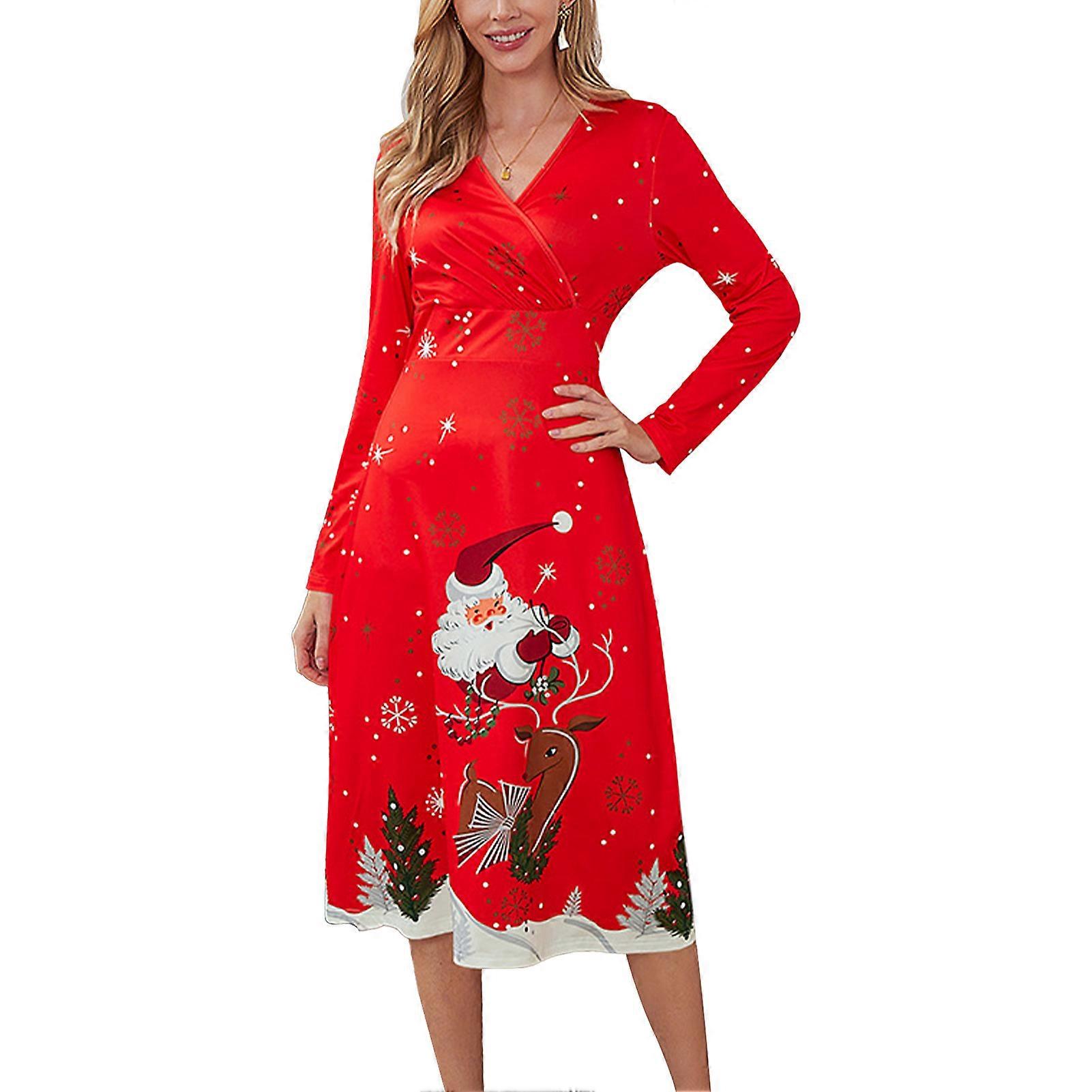 GPB Women Christmas Print Long Dress V Neck Long Sleeve Wasit Slimming Christmas Pattern Casual Dress