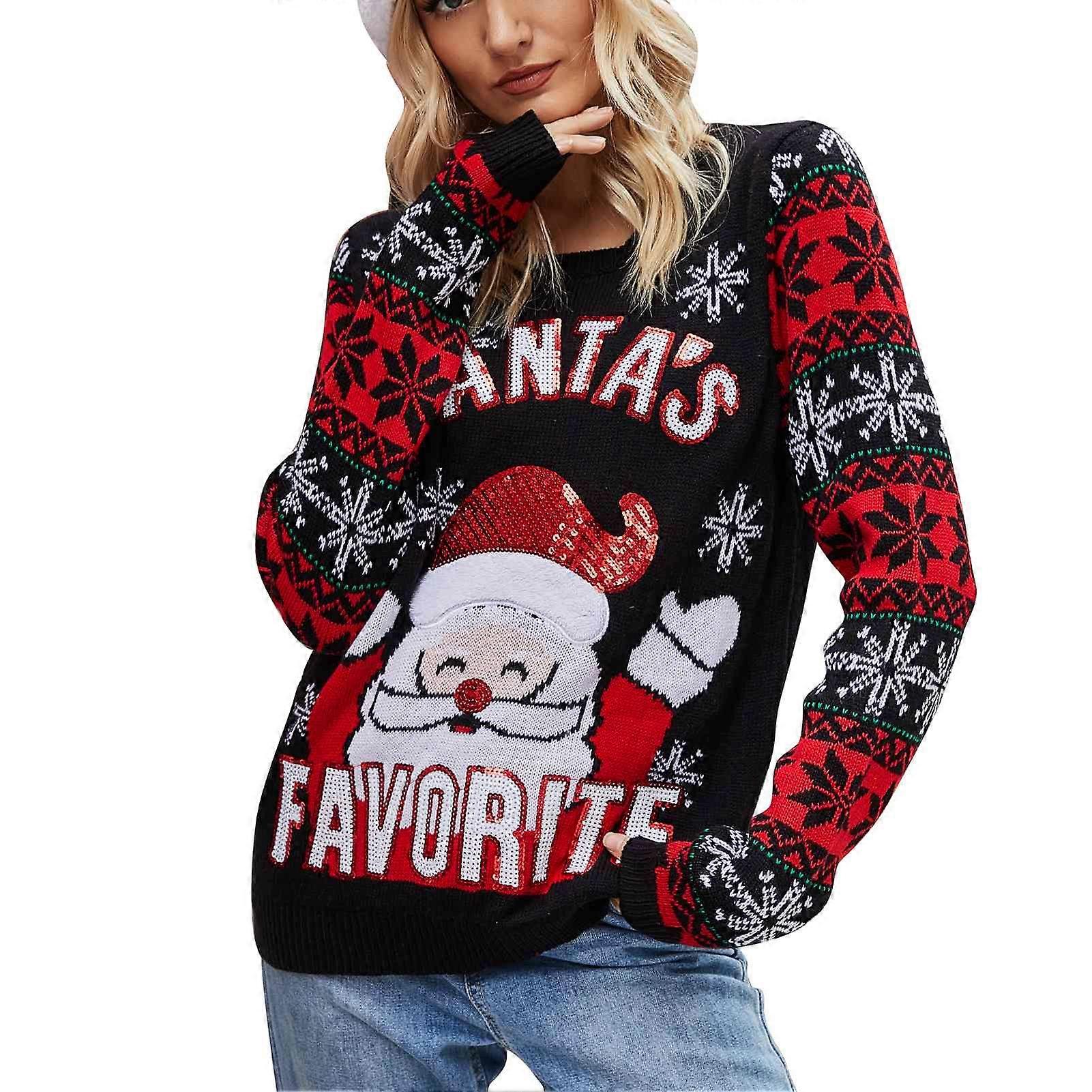 GPB Women Christmas Sweater Fashionable Cute Crew Neck Snowflake Father Christmas Pattern Women Knitted Pullover Black