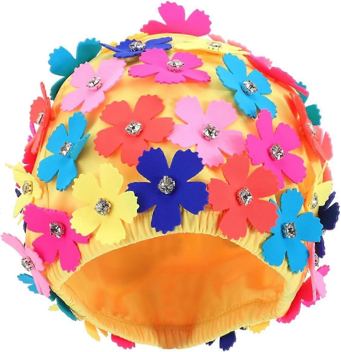 Women Faric Floral Petal Swim Cap, Floral Retro Style Fabric Bathing Cap Fashionable Swimming Hat with Three-Dimensional Flower for Lady Girls Long/Sh