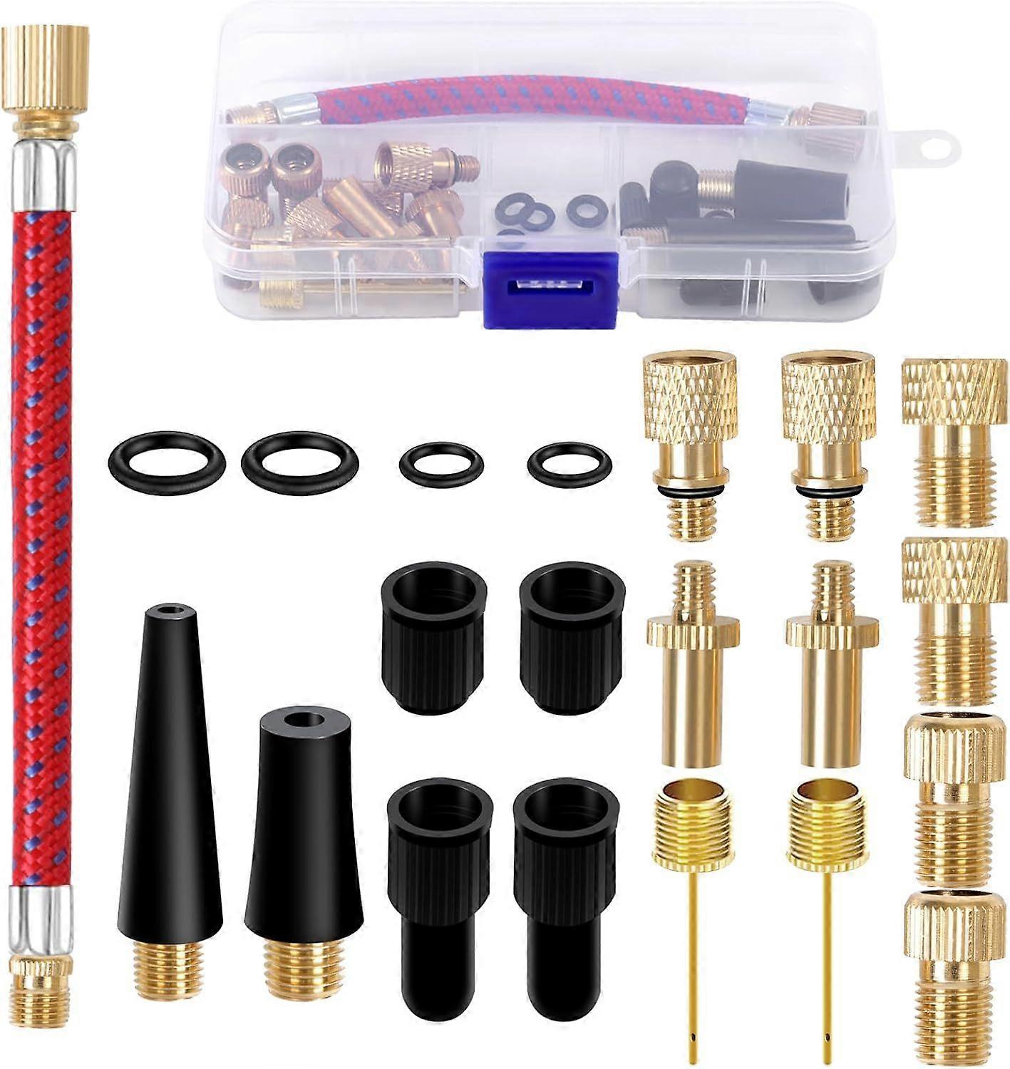 Complete Accessory Set: The bicycle pump adapter set includes 8 DV, SV and AV adapters, 2 ball needles, 4 valve caps, 1 inflation hose, 2 cone adapters and 4 sealing rings, which can meet different inflation needs in different situations. High-quality Materials: This bicycle pump adapter is made of high-quality copper, which has excellent corrosion resistance and superior durability. This guarantees long-term stable inflation quality and minimizes resistance to pressure fluctuations and environmental conditions. Wide Compatibility: This bicycle pump head is highly compatible with various valve types (including DV, SV, and AV), not only for bicycles, but also for cars, motorcycles, balls, airbeds, and many other applications, eliminating the hassle of switching between different valve types. Easy to Store: This bicycle accessory comes with a convenient storage case, so you can easily store and transport all of your accessories to meet your inflation needs at any time. Multifunctional: This tool set is not only suitable for inflating bicycle tires; it can also be used to inflate sports equipment such as basketballs and soccer balls, as well as pool accessories such as inflatable toys and kickboards. This makes it a very versatile pump adapter set.