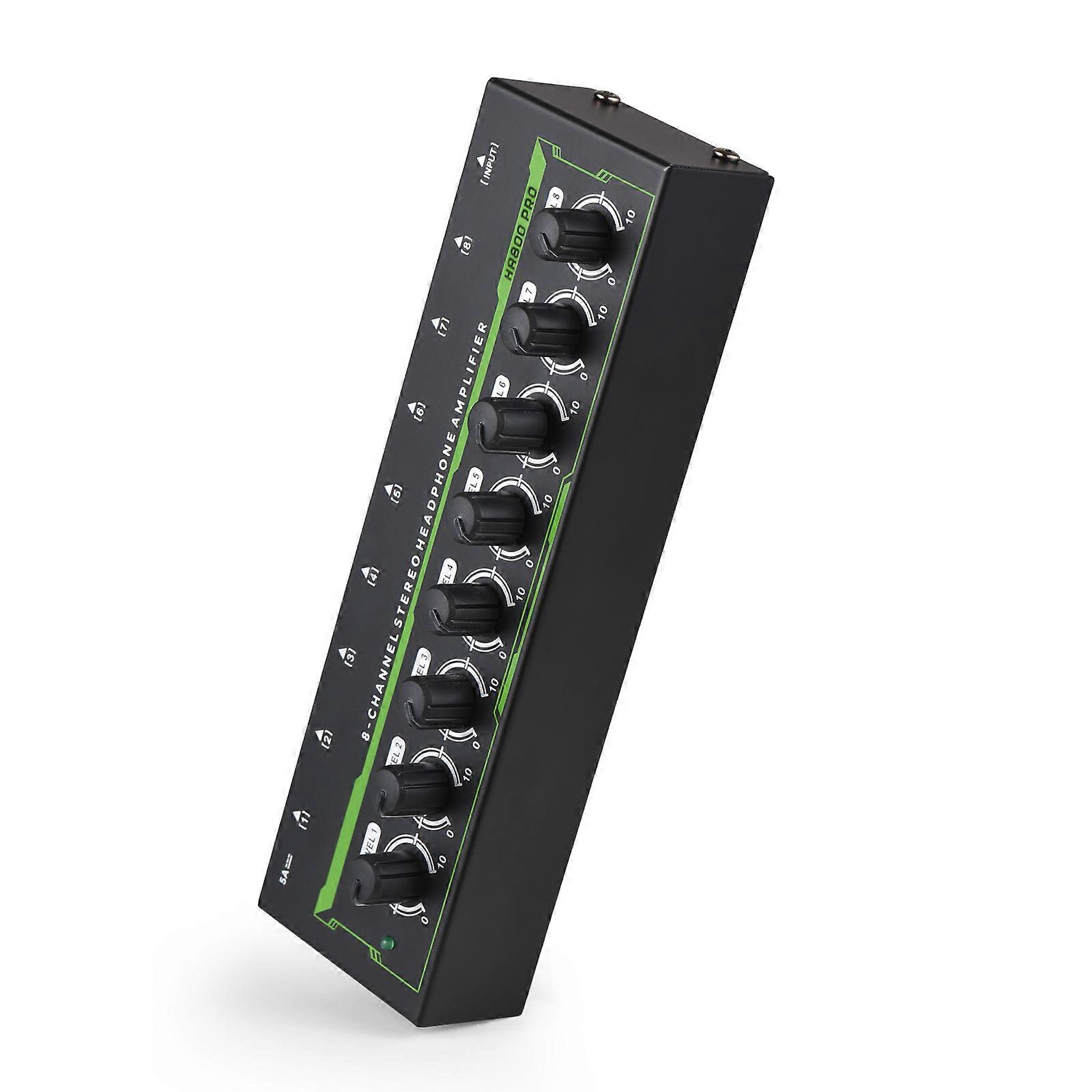 Headphone Amplifier 8 Channel Stereo Headphone Amp Audio Amplifier with Power Adapter DC 12V 6.35mm Input/Output Interface Portable Earphone Amp Splitter for Stage Studio Input: 6.35mm stereo Output: 6.35mm stereo Maximum Impedance of Headphones: 65-80 ohms Power Supply: DC 12V power center is negative Power Adapter: US Plug, EU Plug (optional) Product Color: Black Product Material: Metal Product Size: 19.7 * 5.8 * 3.2cm/7.8 * 2.3 * 1.3inch