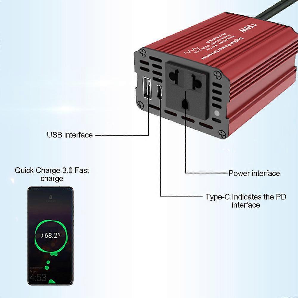 150W 12V to 110V Car Power Inverter USB Type-C Red 8x6.3x4cm