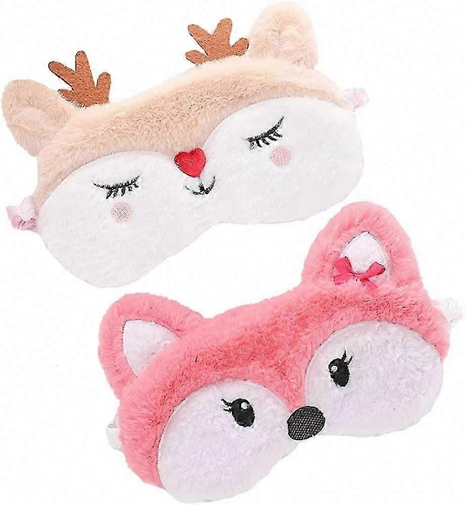 2 Pack Cute Animal Sleep Mask for Girls, Soft Plush Fox Elk Blindfold Eye Cover for Women Travel Nap Night Sleeping