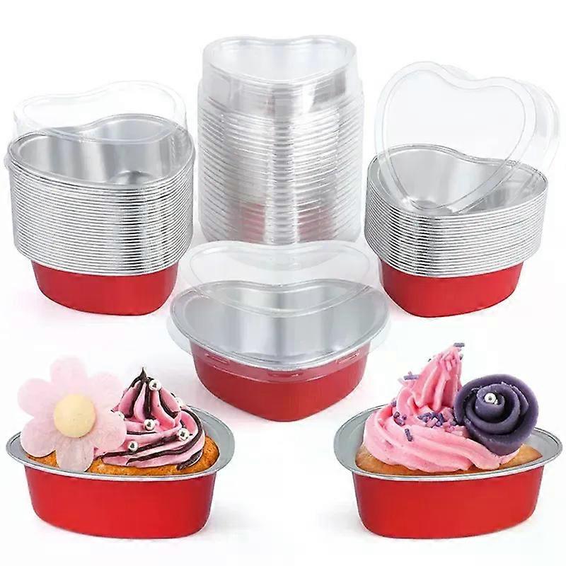 50Pcs 100ml Tin Foil Aluminum Foil Pudding Cup With Lid Heart-shaped Disposable Mini Mousse Cupcake Containers Baking Mould
