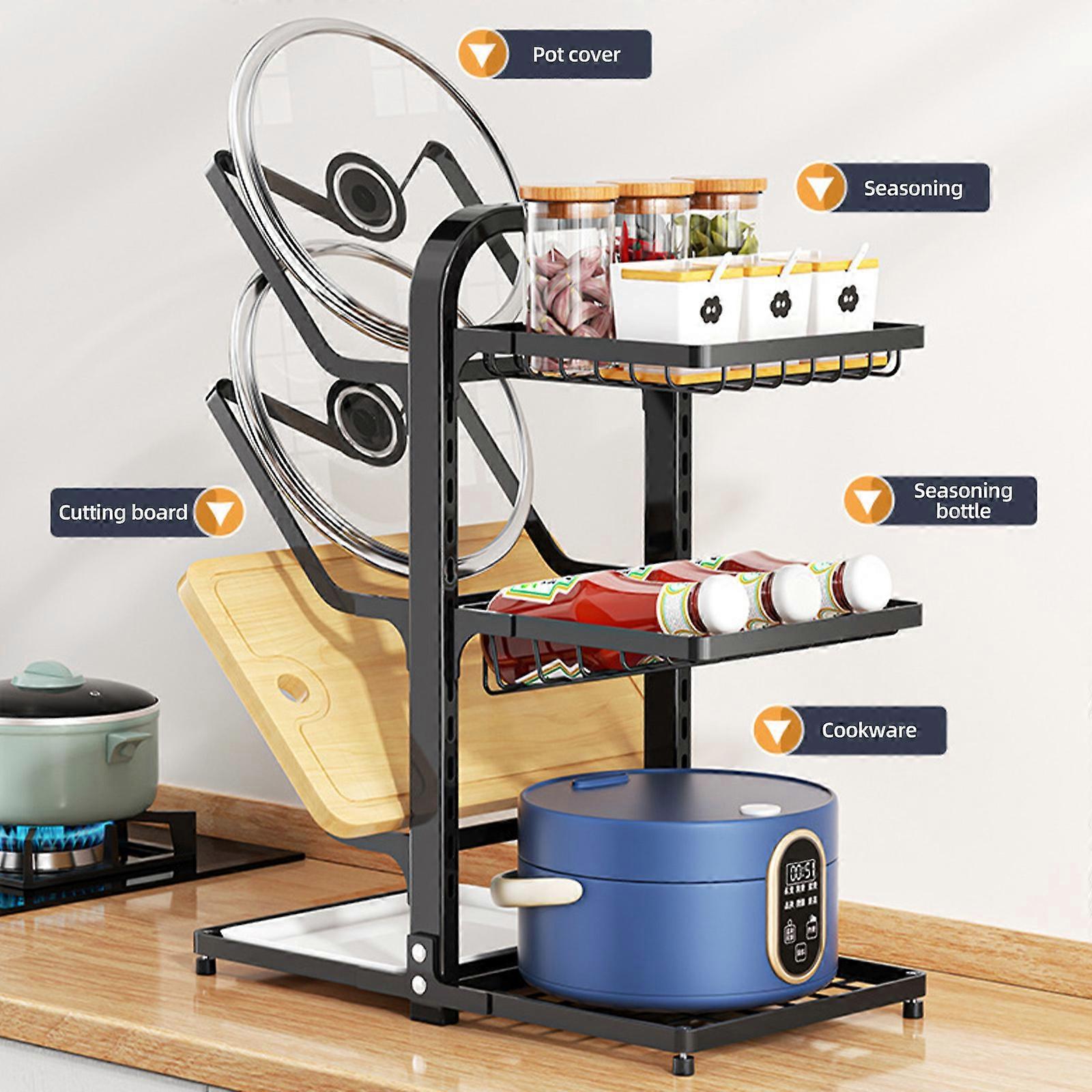 Spice and Pot Cover Rack Carbon Steel 2-Sided 7-Tier Pantry Plates Spice Rack for Cabinet Adjustable Height Multi-Tier Pot Lid Organizer with Water Drip Tray Features: 【Versatile Kitchen Organizer】 - This carbon steel kitchen countertop pot lid storage rack offers a convenient and space-saving solution for organizing your kitchen essentials. With its adjustable 3-tier spice rack and 3-tier pot lid rack, also available in 4-tier spice rack and 3-tier pot lid rack (Optional), you can easily customize the height to accommodate different items. Say goodbye to cluttered countertops and enjoy a neatly organized kitchen with this multi-layer storage shelf. 【Efficient Cabinet Organizer】 - Made from durable carbon steel, this pot and pan organizer is designed to maximize cabinet space and keep your cookware within easy reach. Its sturdy construction ensures stability while the adjustable layers provide ample storage for pots, pans, and lids, and spice. No more searching for misplaced items or dealing with messy cabinets - this cabinet organizer will transform your kitchen into a well-organized space. 【Convenient Pot Lid Organizer】 - Tired of struggling to find the right pot lid? This multi-tier lid organizer solves that problem by providing a dedicated storage space for your pot lids. The adjustable layers allow you to store lids of various sizes, keeping them easily accessible and neatly organized. Save time and effort in the kitchen with this practical and efficient pot lid organizer. 【Space-Saving Lid Organizer】 - Say goodbye to cluttered countertops and hello to a tidy kitchen with this cabinet organizer. Whether you have limited counter space or simply want to keep your kitchen tidy, this versatile rack is a must-have. The adjustable layers offer ample storage for both pot lids and spice jars, allowing you to maximize your space and keep everything within easy reach. 【Multifunctional Spice and Pot Cover Rack】 - This kitchen pot cover shelf is not only a great organizer for your spice jars, but also a practical pot lid holder. The included draining tray ensures that any excess water or oil is collected, keeping your countertop clean and dry. Whether you need to organize spices or store pot lids, this multifunctional rack has got you covered. Say goodbye to clutter and hello to a well-organized and efficient kitchen. Specification: Product material: Carbon steel Product size: 56.5 x 40 x 22cm / 22.24 x 15.75 x 8.66in Type: 3 tier seasoning rack + 3 tier pot cover rack, 4 tier seasoning rack + 3 tier pot cover rack (Optional) Packing List: 1 x Spice and Pot Cover Rack