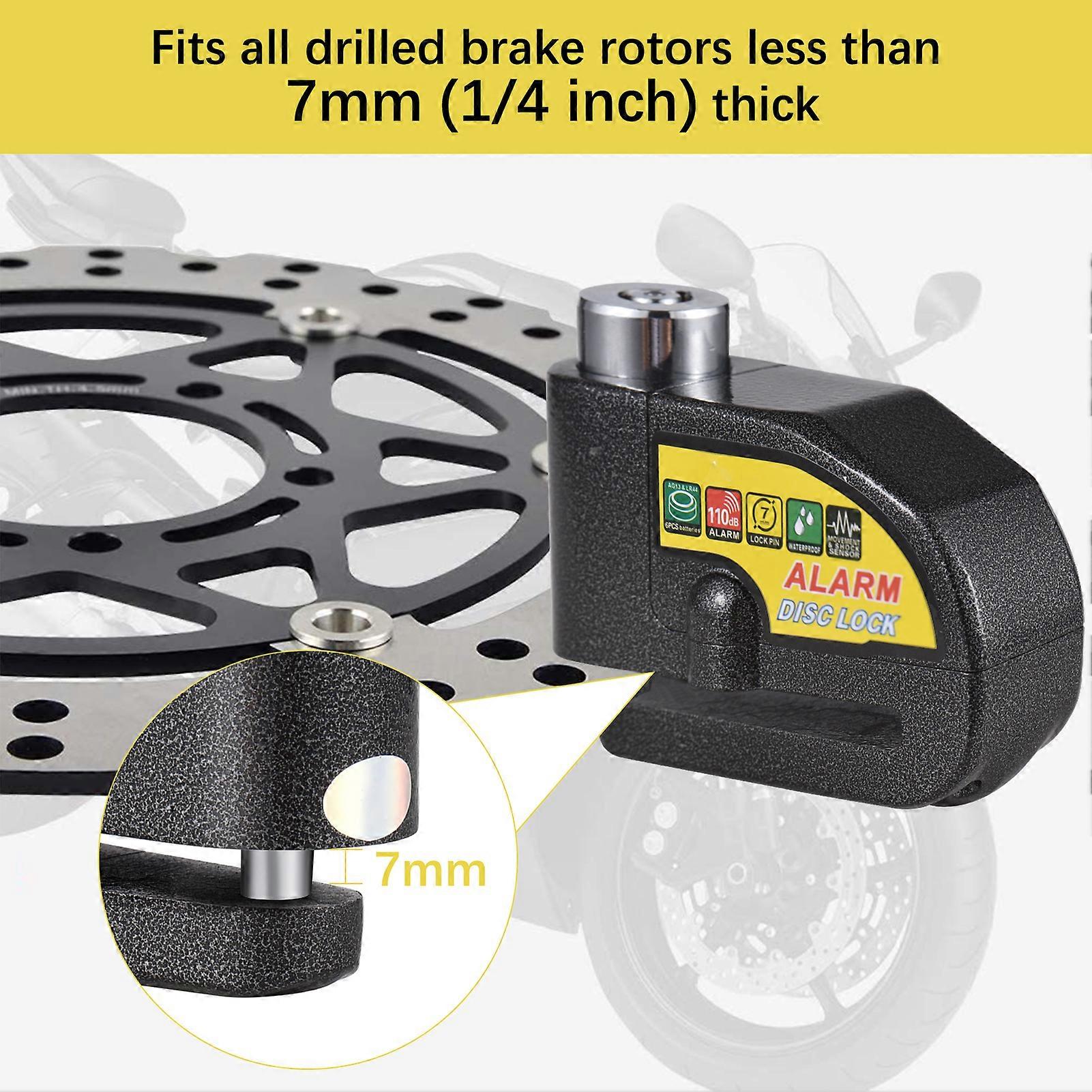 Disc Lock with Alarm Disc Brake Lock Motorcycle Alarm Lock Anti-Theft Security Wheel Disc Lock 110dB Alarm Waterproof Battery Operated with Disc Brake Lock Reminder Cable 2pcs Keys for Motorbike Bike Scooter Features: Professional disc lock to keep your motorcycle, scooter, moped, or bicycle from getting stolen. Waterproof anti-theft disc brake lock, no worry in rainy days. Made of sturdy materials, anti saw, anti shear, and anti-corrosion, perfectly protect your vehicle. Fits all drilled brake rotors less than 7mm (1/4 inch) thick. It will make 110dB loud sound when the built-in sensors detecting shocks and movements. Easy e, press to lock, and unlock with key. Wide scope of application, it suitable for most vehicles, such as disc brake motorcycles, electric vehicles, bicycles, scooters. Equipped with a spring steel wire rope to prevent you from forgetting to unlock the lock. Using Guide: 1.Press the lock core, it will be locked and you will hear the sound "Du", which means it is coming into the alarm situation, after 15 seconds. When the lock body or vehicle is vibrated again, the lock will give an alarm "DU DU DU". When the lock is vibrated again, it will give an alarm and keep alarm with serial vibration. Each alarm will last 10 seconds. 2.Use the key to open the lock, the alarm will stop at once. Battery Replacement: 1.When you hear the sound "Ge. Ge.Ge...." constant voice or the alarm voice less than 10 seconds and stop alarm at once, that means the battery will be worn out, you need to replace the battery. Please use the provided spanner to spin out the four screws, then take away the top cover and replace the battery. Please pay attention to"+" and "-" 2.At regular intervals, clean the keyhole and the pin. Specifications: Material: Aluminum alloy Alarm: 110dB Power Supply: 6 * AG13 button battery Item Size: 90 * 73 * 40mm / 3.15 * 2.87 * 1.57in Item Weight: 324g / 11.44oz Package Weight: 360g / 12.71oz Package Size: 18.8 * 12.2 * 4.7cm / 7.40 * 4.80 * 1.85in Package List: 1 * Lock 1 * Hex Key 1 * Reminder Cable (random color) 2 * Key