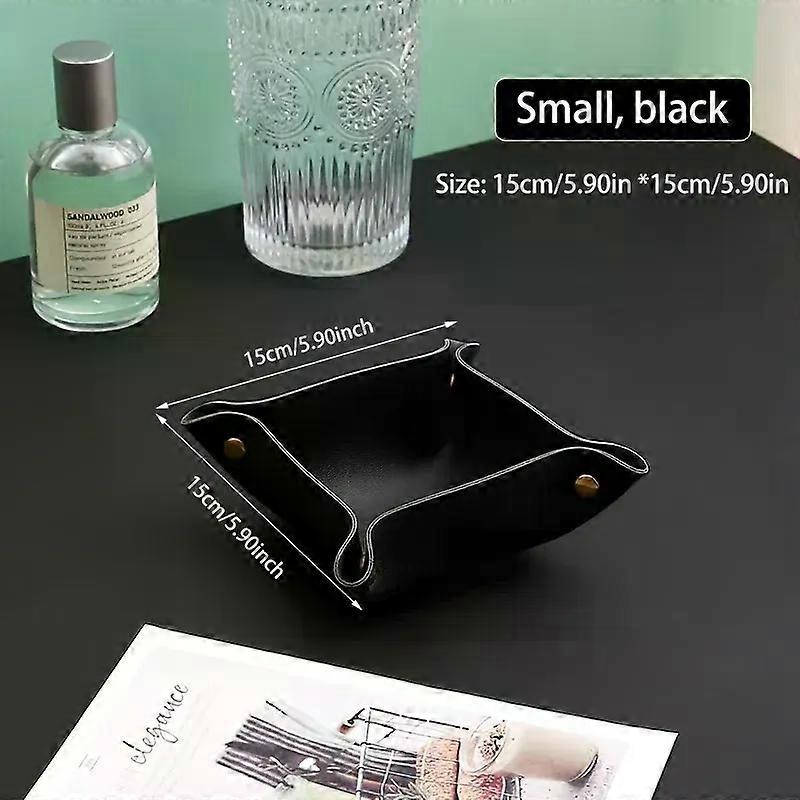 Tray Leather Nightstand Jewelry Tray Desktop Holder Box Leather Snap Tray Sundries Box for Dice Phone Sunglasses Catch All Trays About this item Leather Tray It is made of excellent faux leather which is smooth, durable and easy to clean. The inner of the tray is made of smooth suede leather, which provide a comfortable touch. Exquisite WorkmanshipDouble layers leather dish tray with delicate texture and decent nylon stitching, great in keeping tray shape, and easy to install and clean, only need wipe gently with wet cloth to renew the sheen. Foldable & PortableDesign with snaps in 4 corners, make it easy to fold or unfold and pack flat inside your case or bag. Lightweight and Carry it for outdoors and business trip, easy to locate your items. Multiple Usage & Well OrganizedA must have catchall storage tray for wallet, phone, watch, jewelry, remote controller, keys, trinket and coins or other items on desktop, and keep your items neat and tidy. Sutable storage dish for nightstand, dresser, bathroom, living room and company office desktop. Collect your items in one place with such a great home-organization helper! Great Gift IdeaThis valet tray ideal to be a gift for your mom/dad/husband/boyfriend/wife/girlfriend on anniversary, birthday, thanksgiving day, Christmas and Valentine's day. Also a great gift ideal for weddings, housewarming and daily surprise. Size: S:15x15cm M:20x20cm L:25x25cm Package including: 1PC * Leather Tray _x000D_ _x000D_