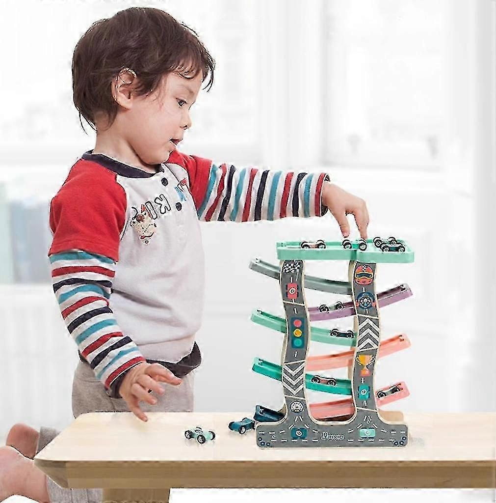 Wood Car Ramp Racer Track for Kids with 8 Wood Racing Cars, Race Track Set