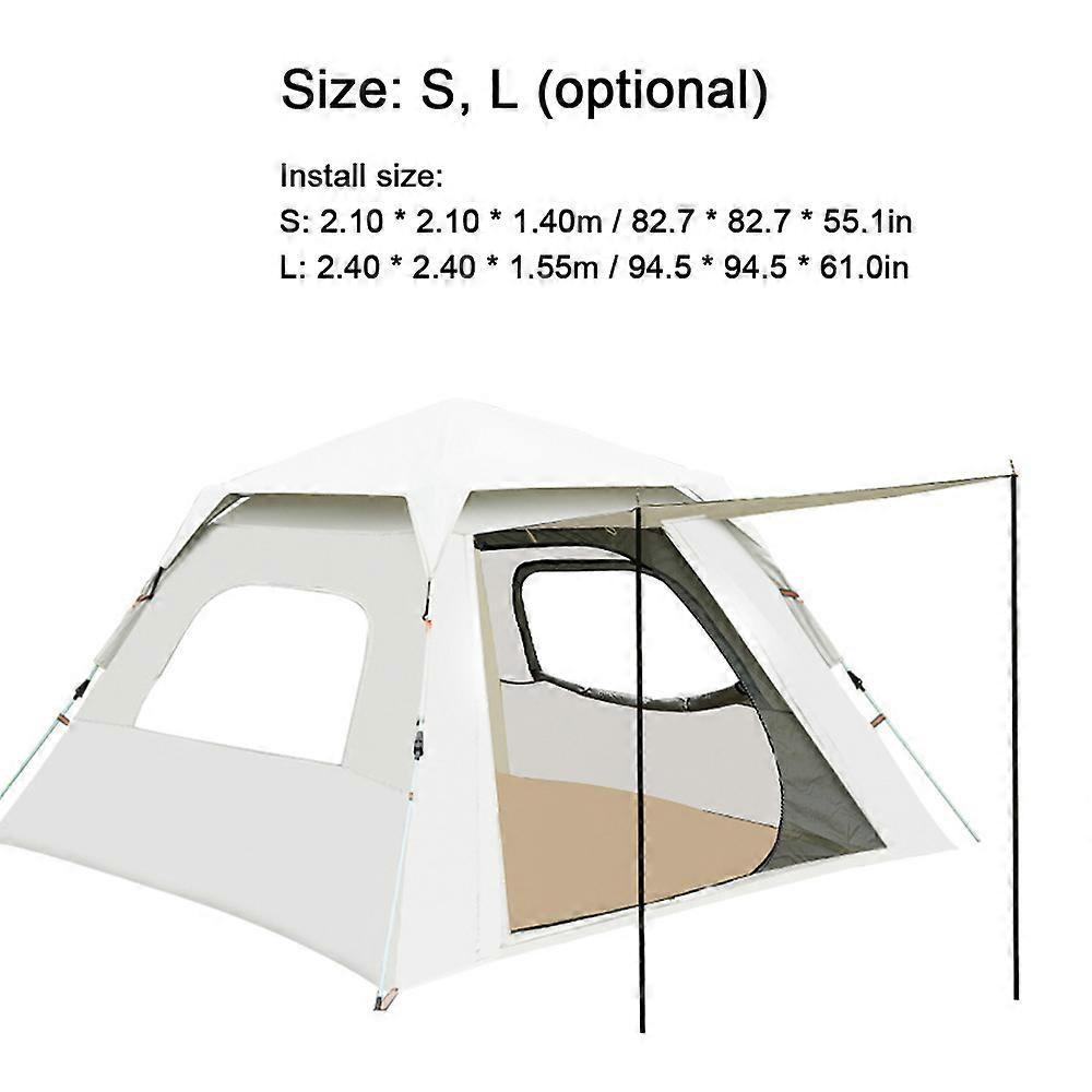 Outdoor Self-driving Travel Camping Tent Automatic Quick-opening Tent Portable Rainproof Sunshine-proof Tent Fishing Hiking Sunshine Shelter This tent is designed for quick opening. It doesn't take a long time to build. It is very time-saving and labor-saving. Besides, it is large enough to accommodate a family. Take it with you and your family to enjoy the weekend. Features: Fully automatic structure, upgraded spring support, easy to lift and pull into a tent. Increased sunshade hallway design, greatly increasing the activity area for sunshade and rainproof. The outer layer is coated with silverglue fabric that is wear-resistant enough as the material of the tent, which is enough to meet your leisure and camping rain-proof and sunshine-proof needs. Double face each other door structure, not stuffy. The space is large enough to accommodate a family. The front and rear of the two hallways are double opened, and the door curtain can be selected for support according to the sunlight direction. (Only one pair of door curtain support rods are included). When it rains, it can be closed all around, effectively protecting the inside of the tent from rain intrusion. Removable ceiling with free choice of opening the dormant window. Interior roof hook for hung camping light. Easy to build and firm in use. Built-in storage bag and hook for more convenient use. With a bag for easy carrying and storage. Specifications: Size: S, L (optional) Color: beige Material: metal+oxford cloth Install size: S: 2.10 * 2.10 * 1.40m / 82.7 * 82.7 * 55.1in L: 2.40 * 2.40 * 1.55m / 94.5 * 94.5 * 61.0in Item size: S: 3600g / 7.9lb L: 4400g / 9.7lb Package size: S: 750 * 150 * 150mm / 29.5 * 5.9 * 5.9in L: 850 * 160 * 160mm / 33.5 * 6.3 * 6.3in Package weight: S: 3800g / 8.4lb L: 4500g / 9.9lb Packing List: 1 * Tent 1 * Storage Bag 2 * Door Curtain Support Rods 1 * Ceiling Cloth 10 * Ground Nail 6 * Wind Rope