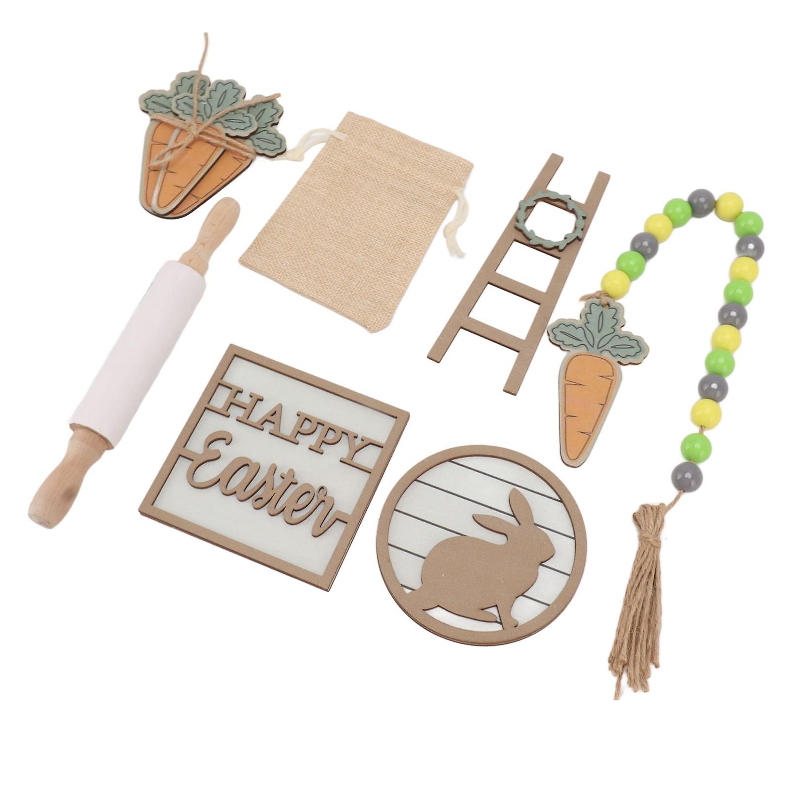 Easter Tiered Tray Decor Bunny Carrot String Bead Rolling Pin Ladder Wooden Easter Tray Decoration Item Type: Easter Tiered Tray Decor Material: Poplar Wood, Plastic Bead, Hemp Rope Rolling Pin Size: Approx. 20.2x2.5cm/8x1in Category: Process Pendant Weight: Approx. 167g/5.9oz