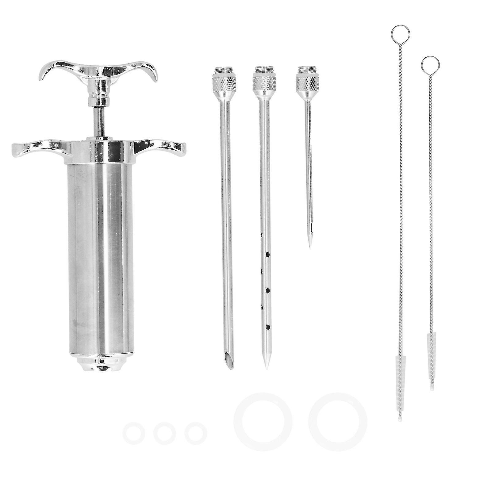 Features 1、Ergonomically designed for one‑hand injecting handles, sturdy seasoning injector needle with hole for deep penetration and perfect sauce distribution with liquid brine/marinades. 2、Our perfectly crafted seasoning injector make every bite of the meat is flavorful. Perfect for intensifying the flavor of brisket, pork, chicken, turkey, lamb, goose, duck, and more! 3、Made of 304 food‑grade heavy‑duty stainless steel. Durable and incisive, the needles puncture any meat or poultry with ease, ensuring you can enrich the taste of toughness or thick cuts. 4、Easy cleaning, our meat injector is designed for quick and easy disassemble. With 2 cleaning brushes makes clean up super easy, dishwasher‑safe. 5、Lightweight, compact, easy to carry, suitable for indoors cooking, holiday dinners, baking, toasting, roasting, and outdoors BBQ, smoked grill. Specifications Item Type: Meat Injector Material: 304 Stainless Steel + Silicone Color: Silver Injector Barrel Size: Approx.15cm / 5.9in Needle Length: Approx.15cm / 5.9in, 15cm / 5.9in, 10.5cm / 4.1in Cleaning Brush Length: Approx.19.2cm / 7.6in, 16.5cm / 6.5in Silicone Rings Size: Approx.3cm / 1.2in, 1.2cm / 0.5in Weight: Approx. 354g / 12.5oz Package List 1 x Injector Barrel 3 x Needle 5 x Silicone Rings 2 x Cleaning Brush 1 x English Manual