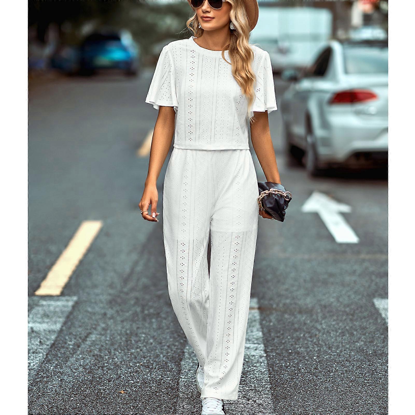 Women Beige Pure Color Crochet 2 Piece Outfit XL Casual Set