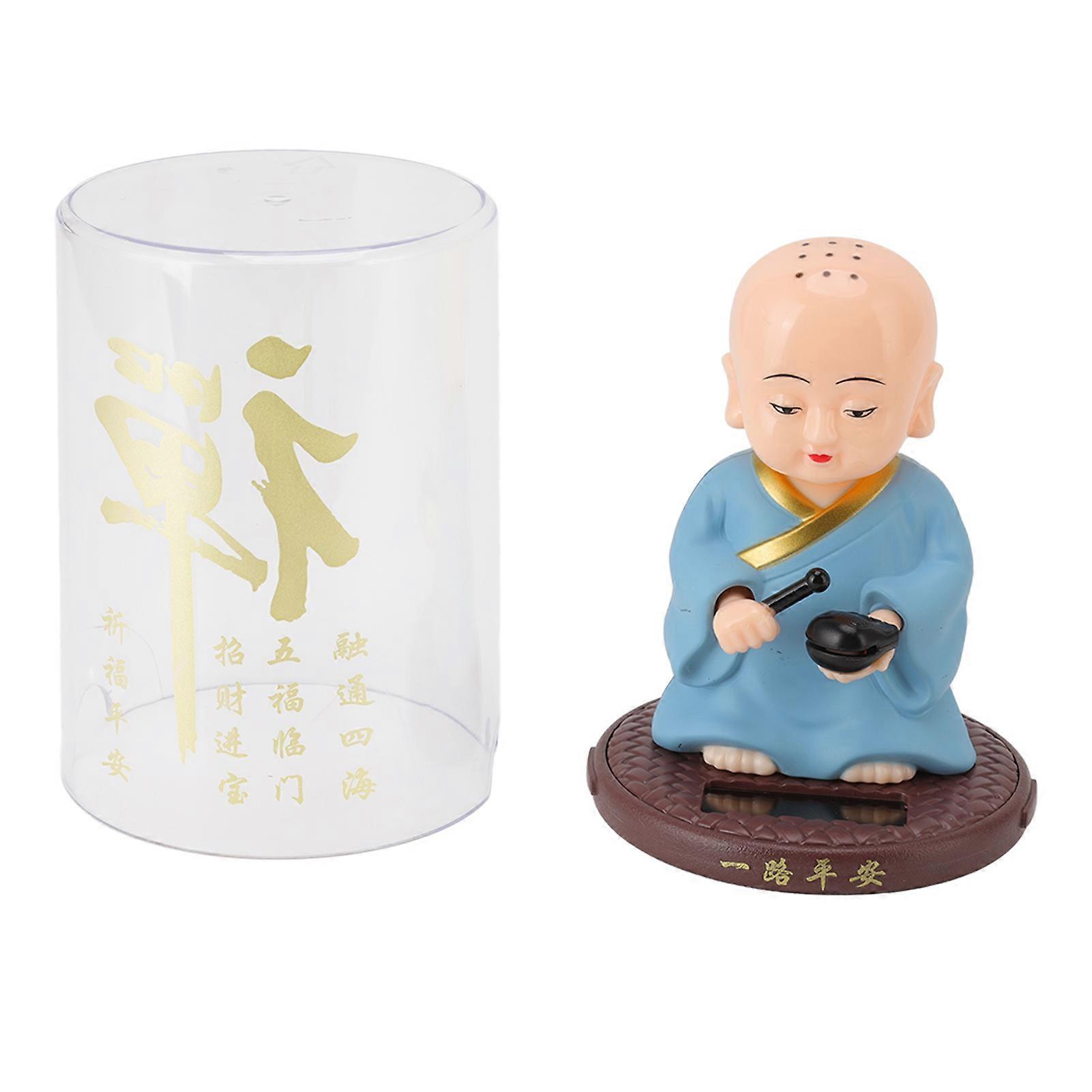 Cute Monk Car Ornament Solar Powered Waving Hands Little Monk Figurines with 2 Anti Slip Mats for Home Blue