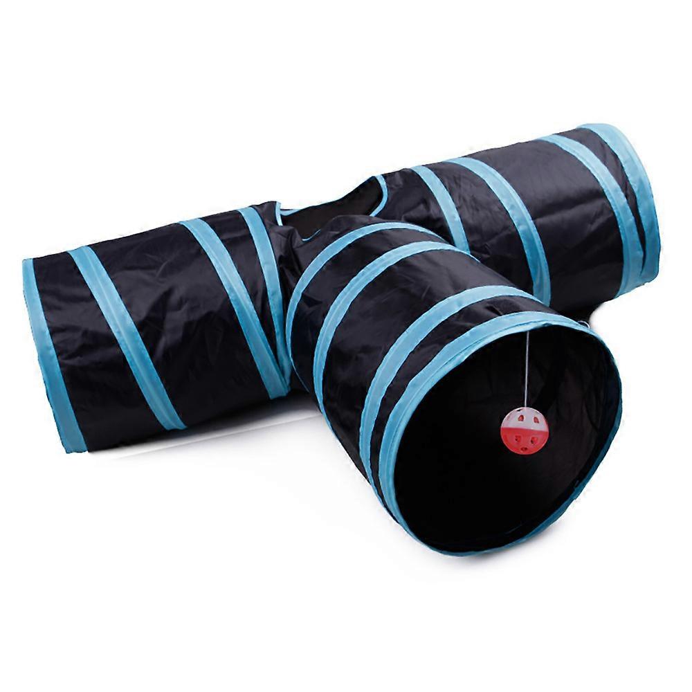 <p>Sturdy Durable: The cat tunnel has a strong spring steel frame and tear-resistant polyester taffeta, withstands crazy cat scratching. And the center won't collapse like other tunnels.</p> <p>Interactive Cat Toy Bell: The peephole in the middle and the hanging bell make noise, which will encourage curiosity and keep your cat entertained for long hours. Interactive cat toy incorporates beads and feathers to attract and challenge your pet to pounce and chase.</p> <p>Good for Health: Your pet can play hide and seek, bounce and chase in the cat tunnel. Encourage healthy activities and inspire your pet's natural hunting instincts.</p> <p>Collapsible and Portable: The tunnel opens in seconds and can be folded easily and secured by the provided elastic band for easy storage and transport.</p> <p>Size: as shown</p> <p>Color: blue black edge</p> <p>Delivery Quantity: 1 piece</p>