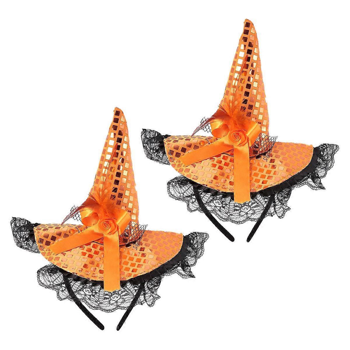 2pcs Halloween Hat Witch Headband Masquerade Party Head Wear Ruched Lace Sequin for Decoration Orange