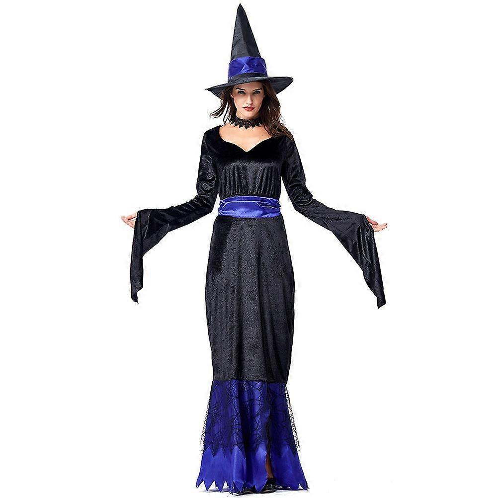 Blue and Black Halloween Costume Set Witch Dress Party Outfit for Masquerade Performance Cosplay (Dress+Hat+Necklace, Size XL)