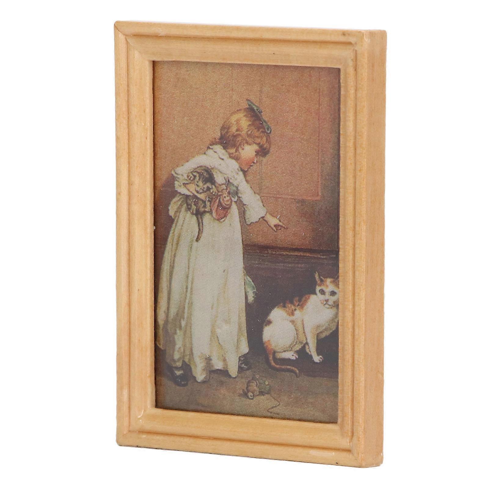 Mini Painted Wooden Frame Girl & Cat 7.5x5.5x0.6cm for 1/12 Dollhouse