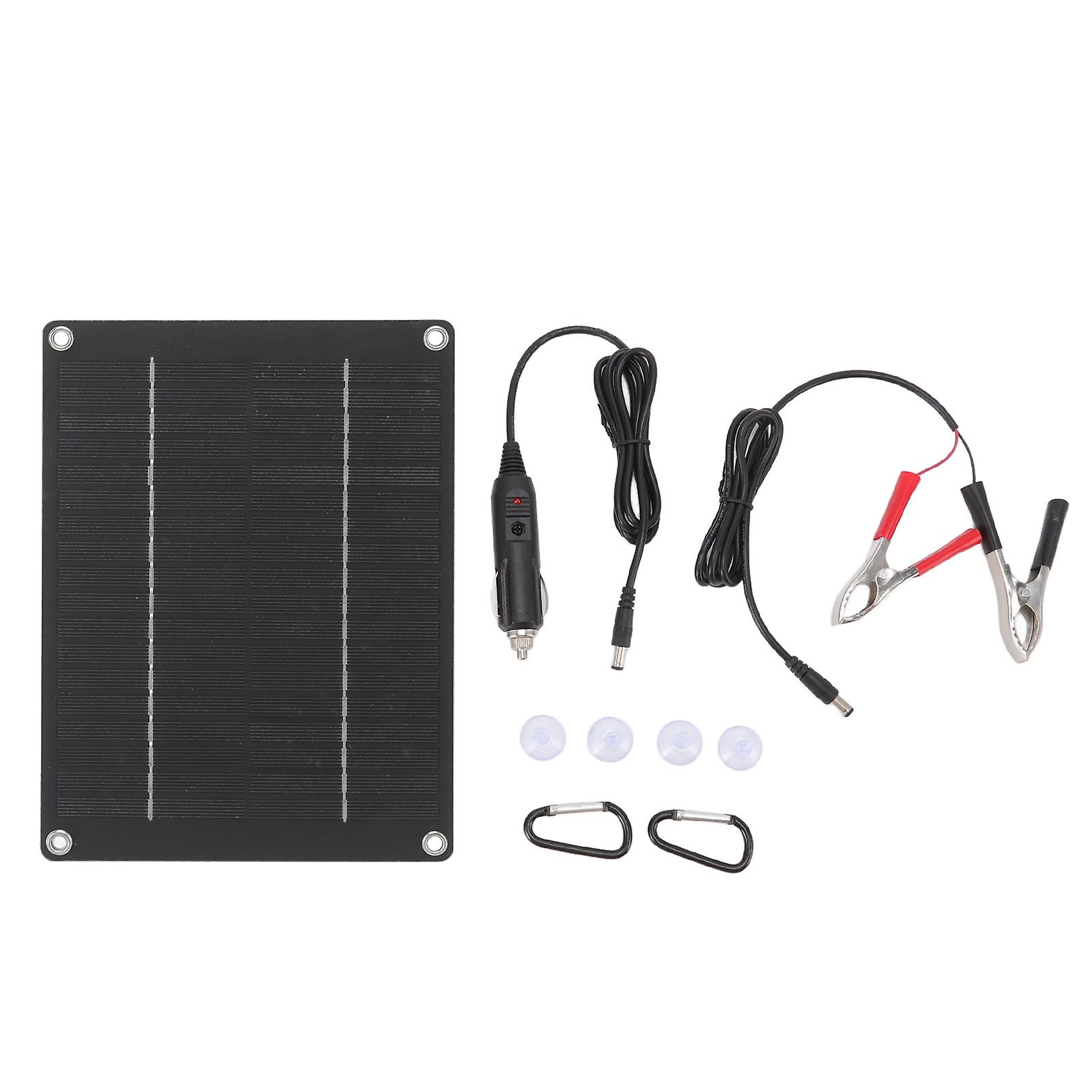 Features 1、Easy Installation: Ideal for invisible solar installations. And the solar panel is easy to carry, install, hanging and remove. 2、Waterproof: The solar panel is made of premium material, waterproof and can be placed outdoors. 3、Lightweight and Portable: The solar panel has a thin and light design, light weight and easy to carry, suitable for both outdoor and indoor use. 4、Wide Range Of Uses: Can supply power for emergency lights, advertising lights, traffic lights, electric fans, solar water pumps and other equipment 5、Scope of Application: This solar charging panel does not have power storage function, it is allowed to be installed on trailers, boats, cabins, tents, cars, trucks, trailers, yachts, trailers, roofs or any other uneven surface. Specifications Item Type: Solar Panel Material: PET, ETFE Power: 10W Output: 18V 5V Weight: Approx.259g / 9.1oz Product Size: Approx.17 x 23cm / 6.7 x 9.1in Package List 1 x Solar Panel 4 x Suction Cup 1 x Car Cigarette Lighter 2 x Carabiner Clip 1 x Insulator Clip Cable
